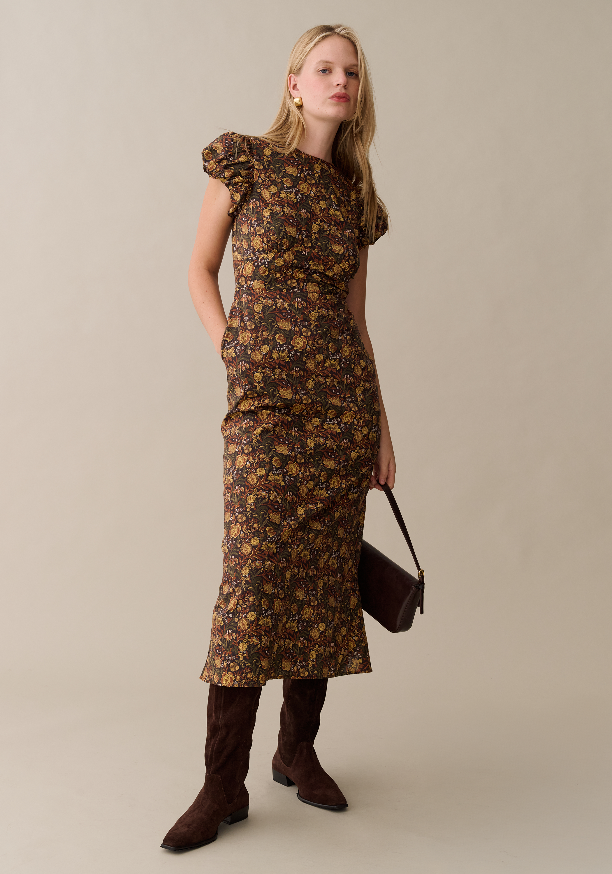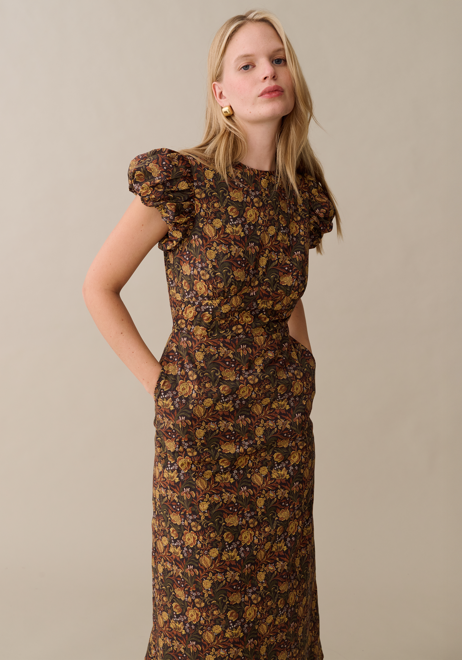 The Vivienne Cotton Dress showcases beautifully crafted puff sleeves and an elegant high neckline, creating a refined, timeless look. Its sleek sheath silhouette gently flares at the hem for subtle movement, while a black velvet ribbon at the back adds a touch of sophisticated detail. Perfect for occasions requiring understated elegance with a modern twist.