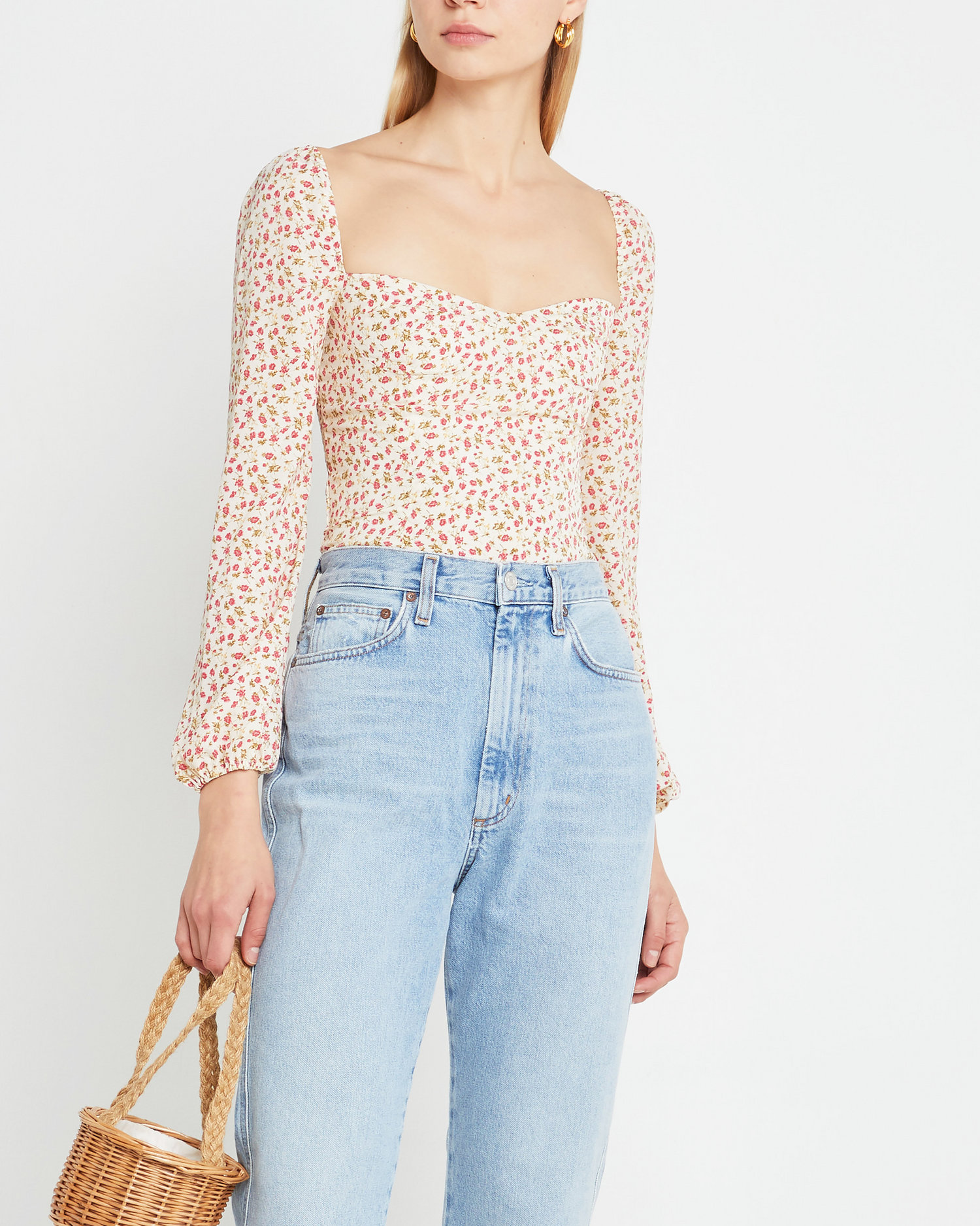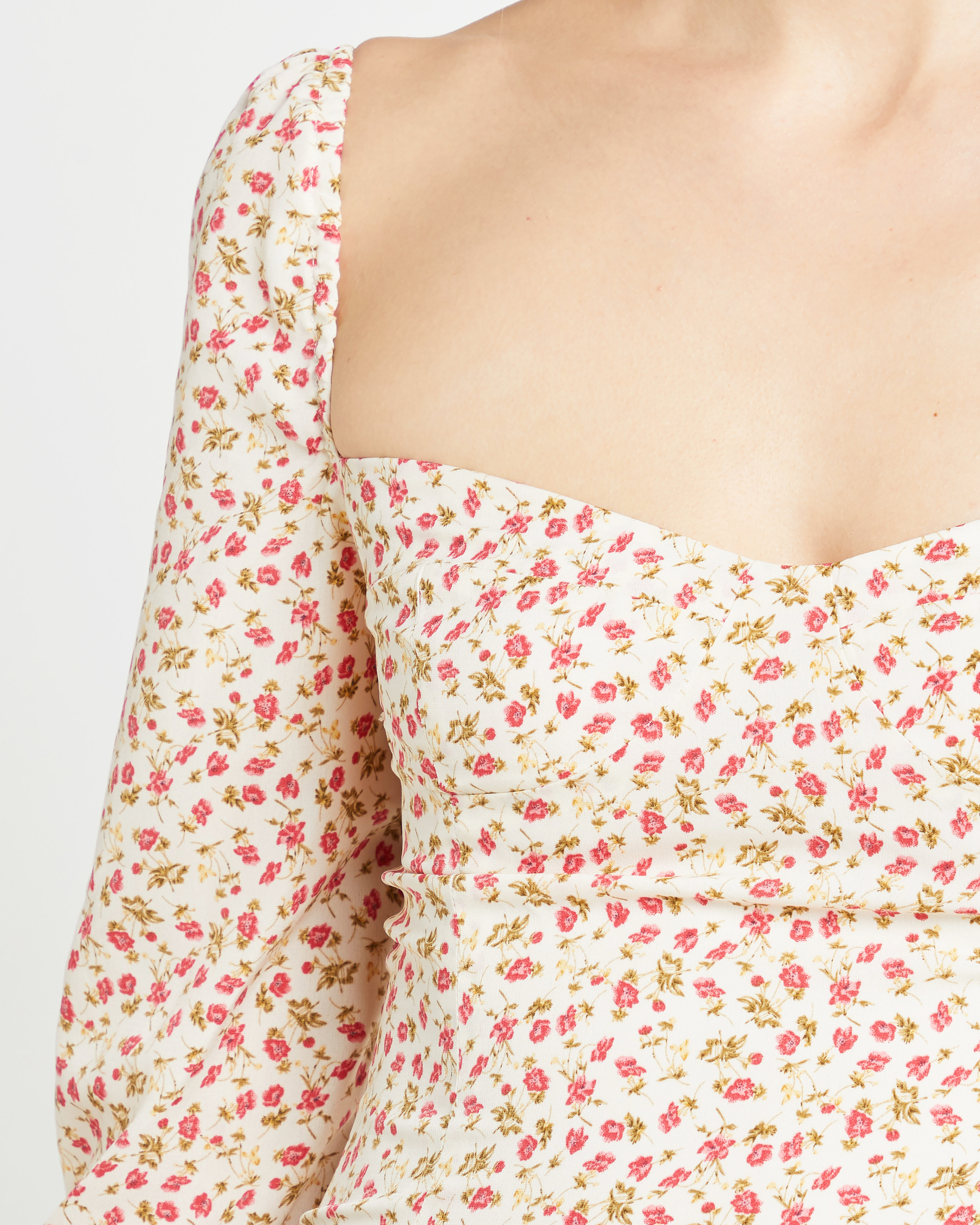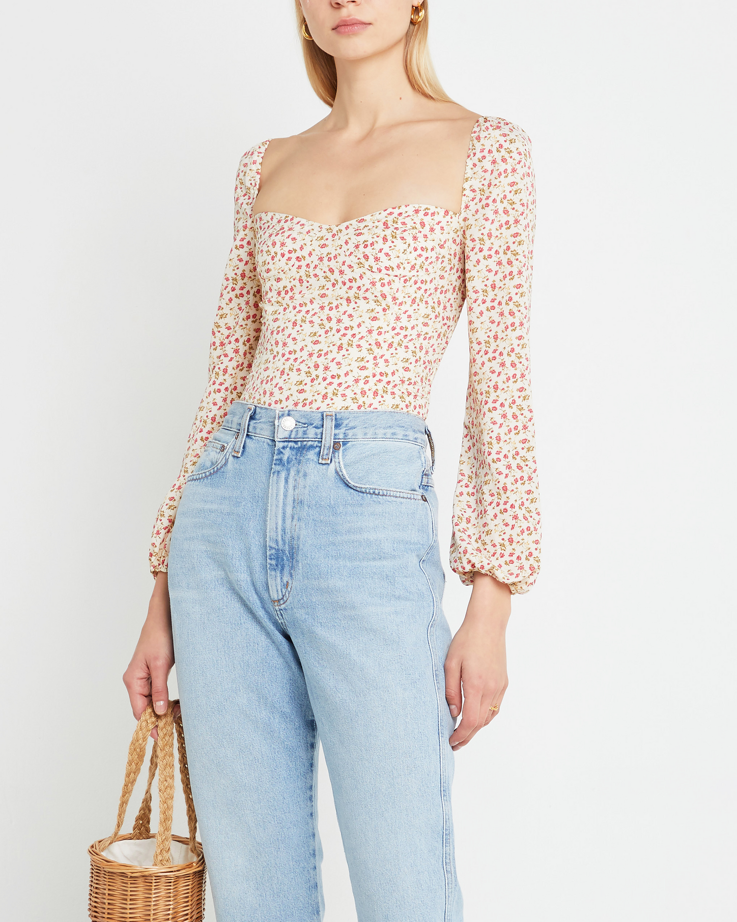 The bustier style bodice of this cool top pairs perfectly with the puff sleeves to create a flattering silhouette. Finished with back smocking.