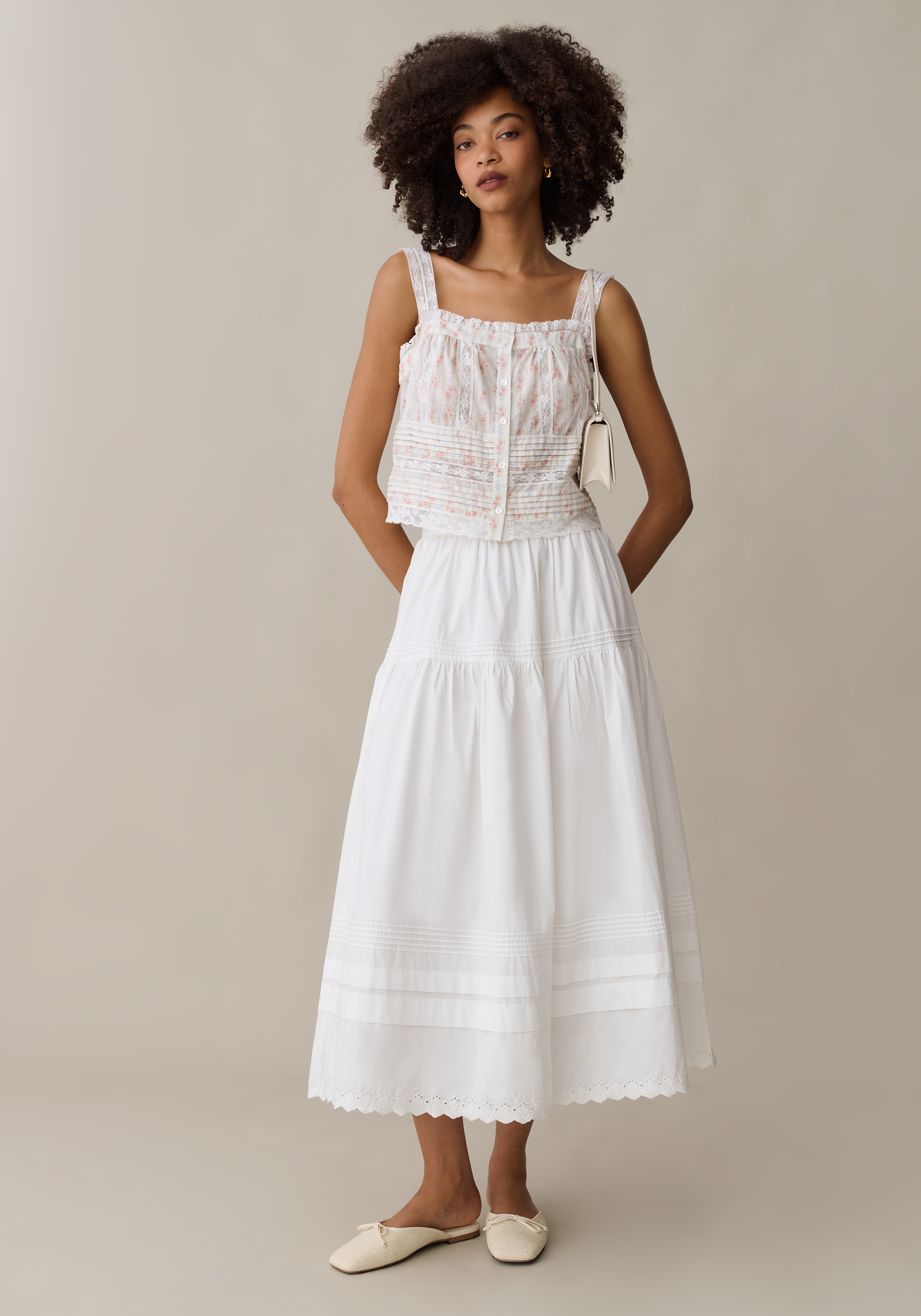 Done with a classic button-front placket and delicate lace straps, this top features an intricate mix of tonal embroidery and horizontal pintucks. The square neckline and sheer lace panels create a sophisticated, textured look that feels both vintage-inspired and effortlessly refined.