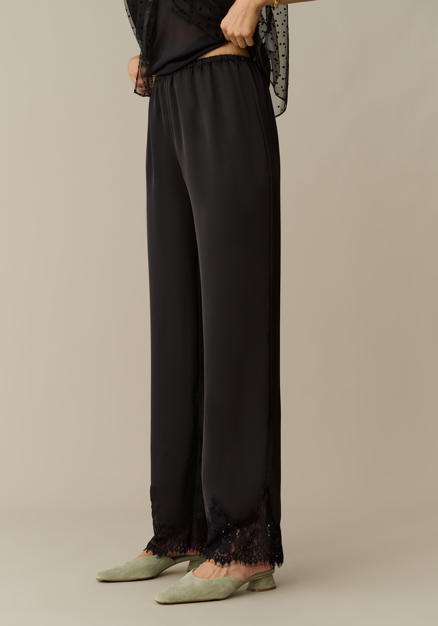 The Yara Pant features a silky smooth material that provides a sleek and comfortable fit combined with an easy elastic waist. Finished with delicate lace trim for a charming detail, these pants are a perfect choice for those seeking effortless elegance.