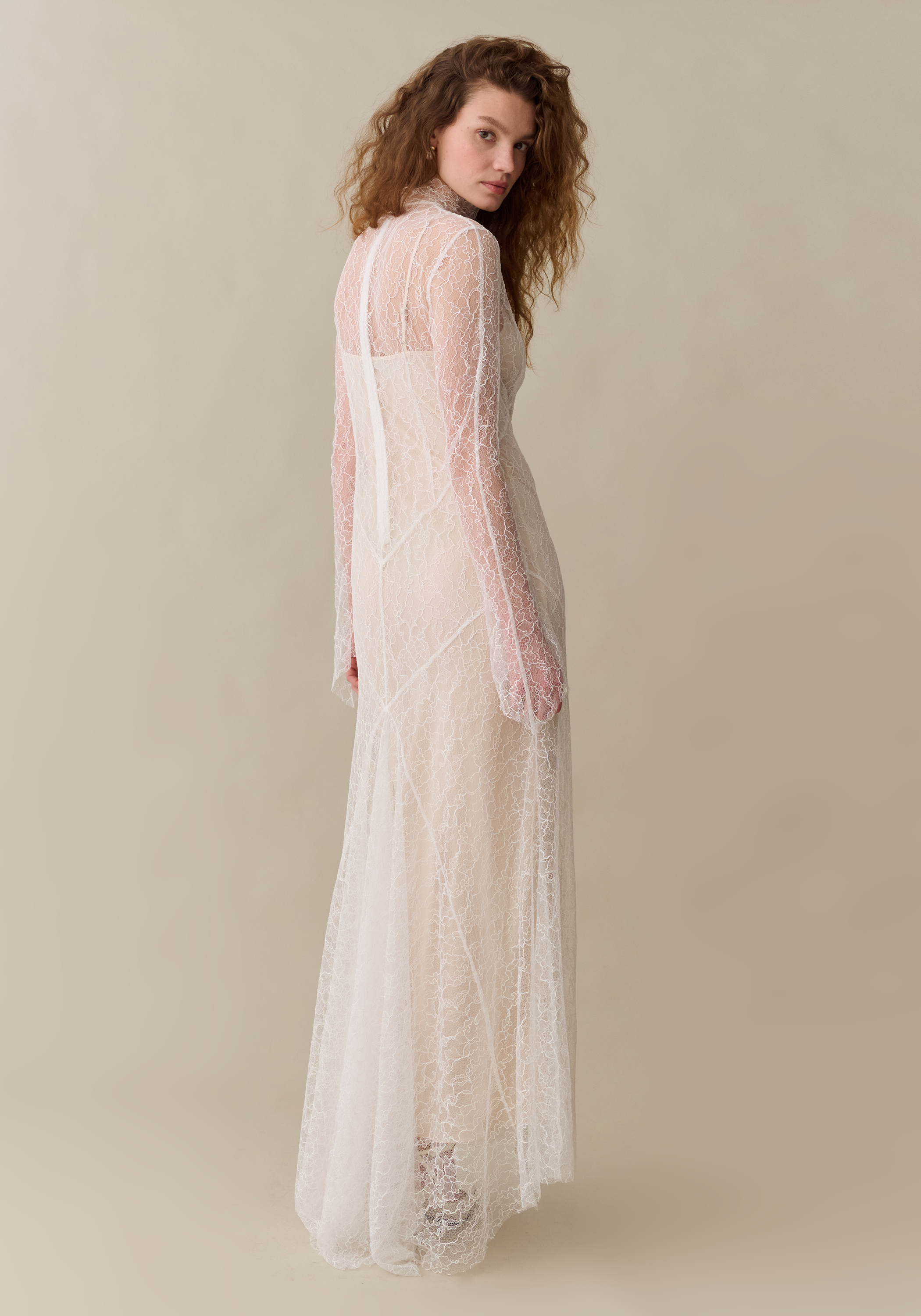 This sheer lace gown exudes quiet romance, featuring a high neckline and long sleeves that balance its delicate transparency. The slim silhouette drapes effortlessly over the body, creating a look that feels ethereal yet modern. Perfect layered over a slip, it captures understated elegance for evening or bridal occasions.