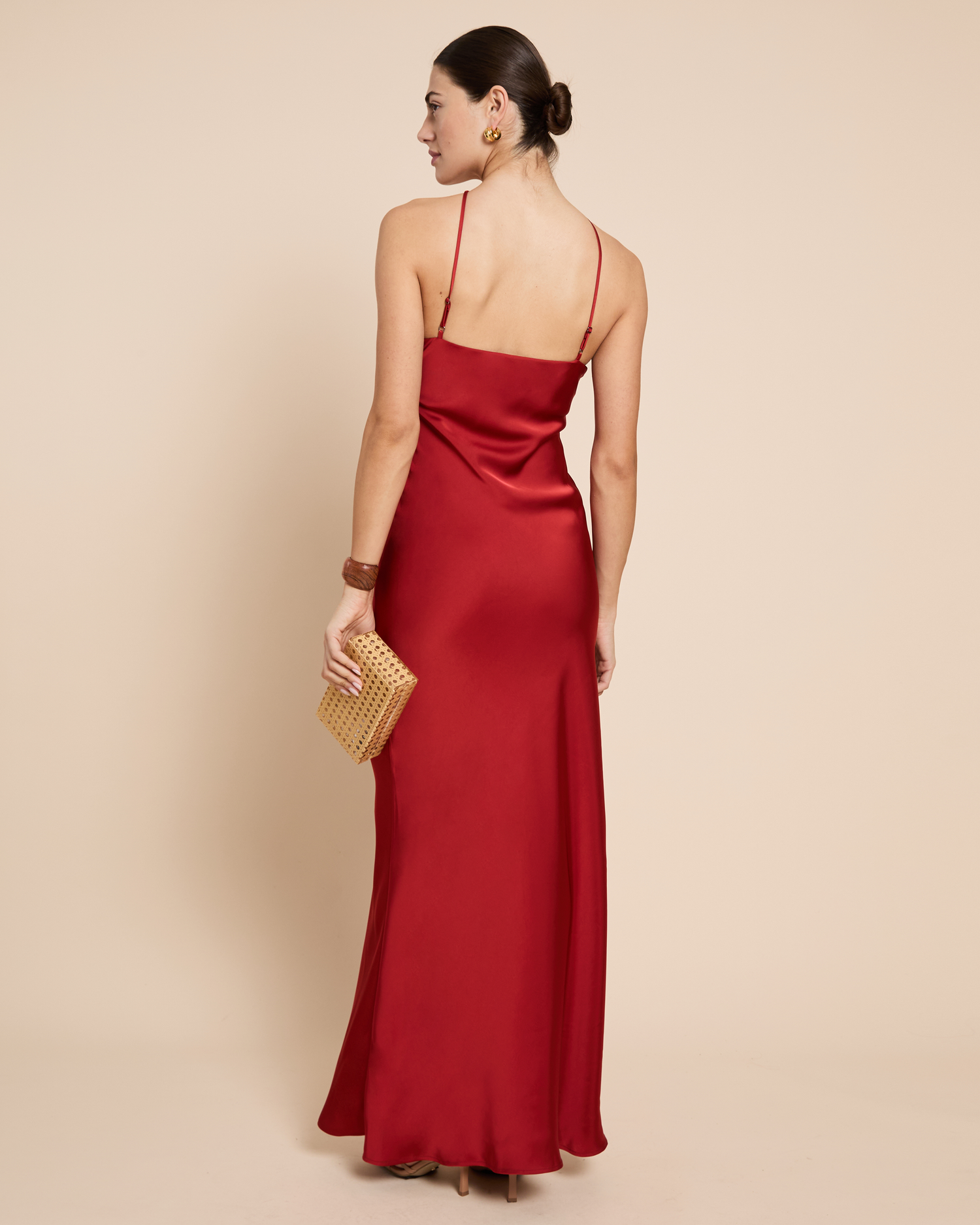 The Auli Dress is expertly crafted with stunning, vibrant silky material for a sleek and chic look. Its sculptural beaded halter neckline adds a unique touch. Elevate your wardrobe with this eye-catching dress.