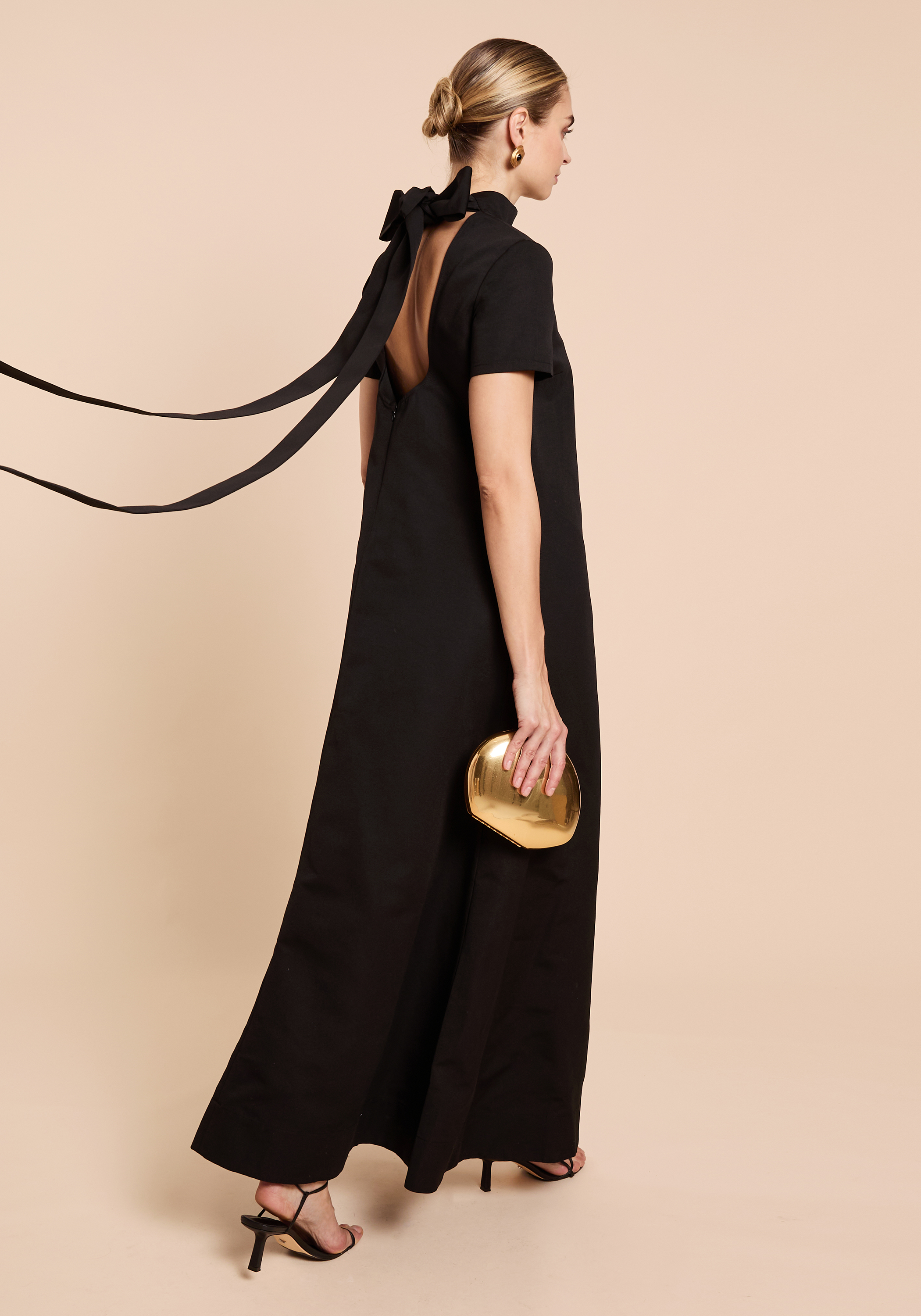 The Ciana Dress is crafted from structured fabric for an ultra elevated look. Its maxi length creates a graceful, elongated silhouette, while the elegant high neckline is enhanced by a sophisticated back bow detail, combining classic elegance with contemporary design for a polished look.