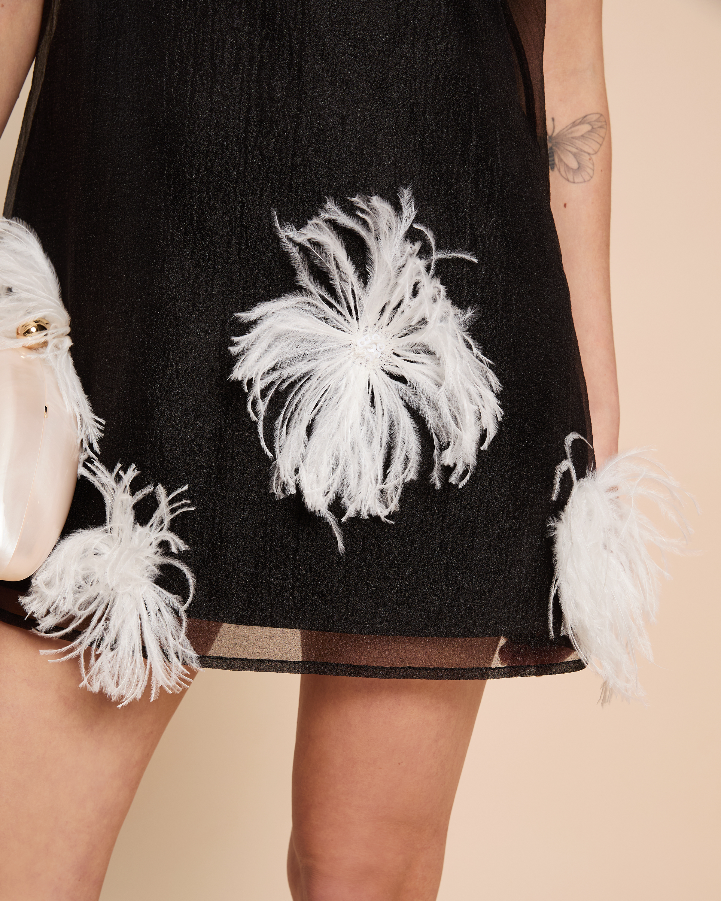 The Kalena Dress features a playful yet sophisticated design. Crafted from textured organza fabric with white feather puff details, it offers a delicate, airy feel complemented by a high neckline for an elegant silhouette.