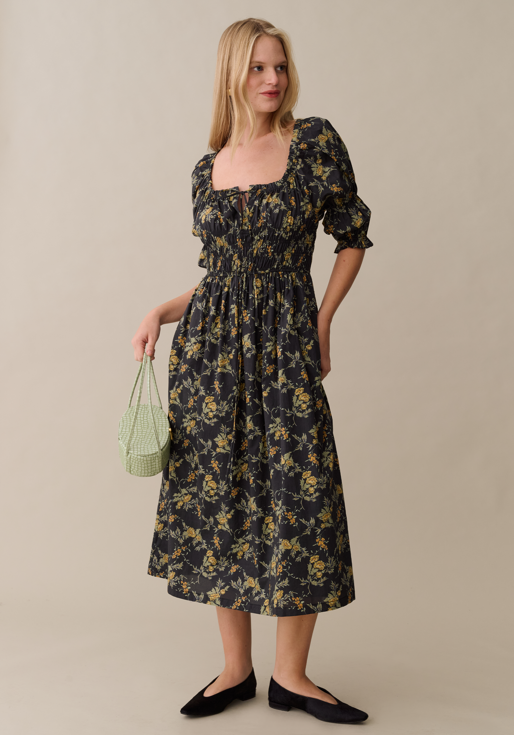 The Marguerite Cotton Dress features a flattering square neckline paired with elegant puff sleeves, creating a timeless silhouette. Its ruched bodice enhances the fit, while a charming tie detail adds a delicate touch.
