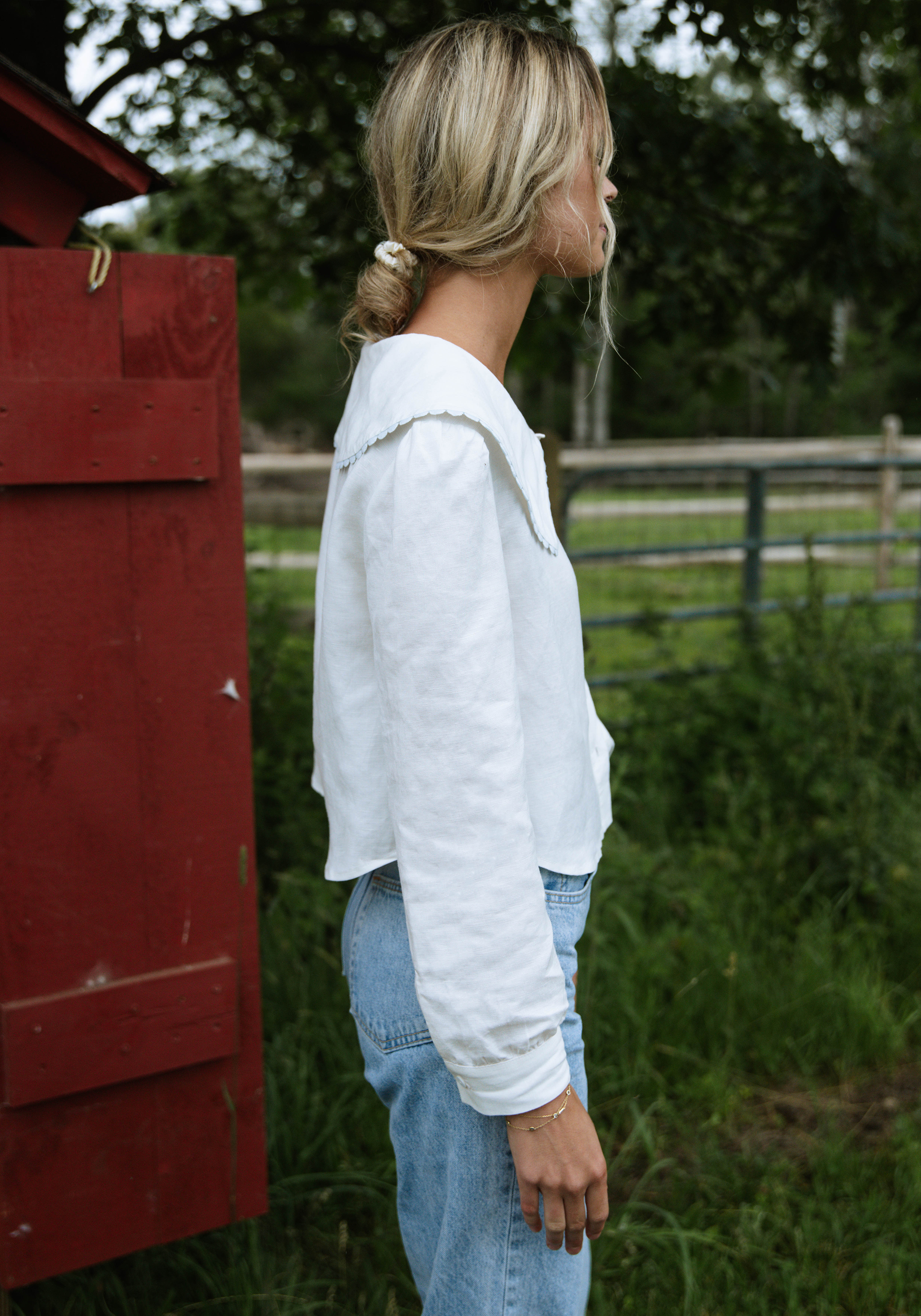Crafted from a breathable linen blend, the Alfresco Top features a button-up design enhanced by an adorable baby blue trim that adds a subtle yet distinctive touch. Its oversized collar shapes a modern silhouette, combining comfort with refined style for a versatile wardrobe staple.