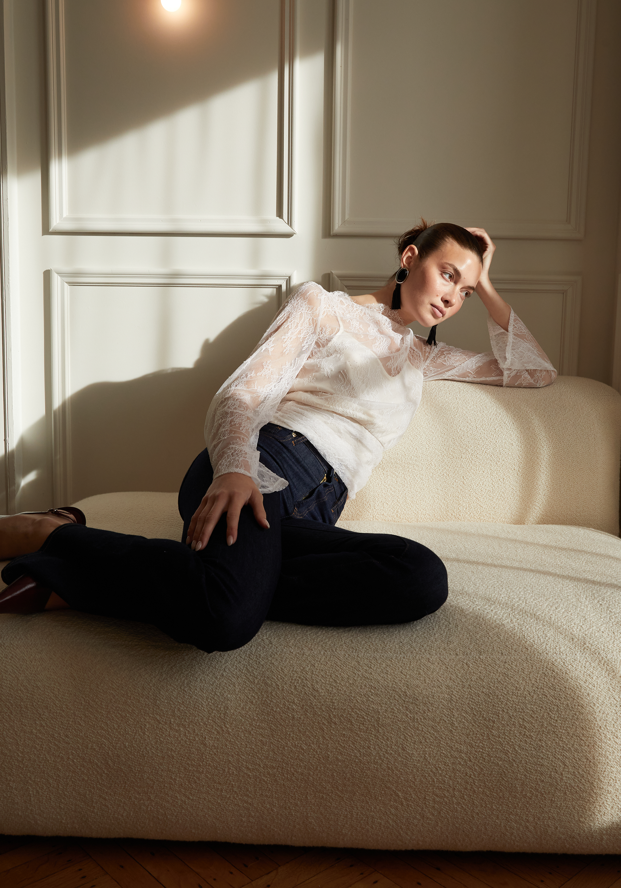 The Salome Top features stunning lace with a dramatic high neckline and built-in front lining for a polished fit. A ruched and fitted waist band is finished with a back tie for an adjustable fit. Delicate and romantic in design, this piece is perfect for those seeking something sophisticated yet impactful.