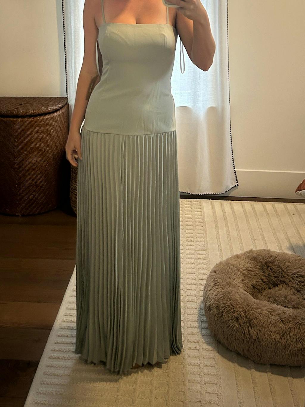 The Zephyra Dress features an elegant, simple silhouette with a flattering drop waist and delicate thin straps. Its pleated skirt adds graceful movement, creating a refined and timeless look perfect for sophisticated occasions.