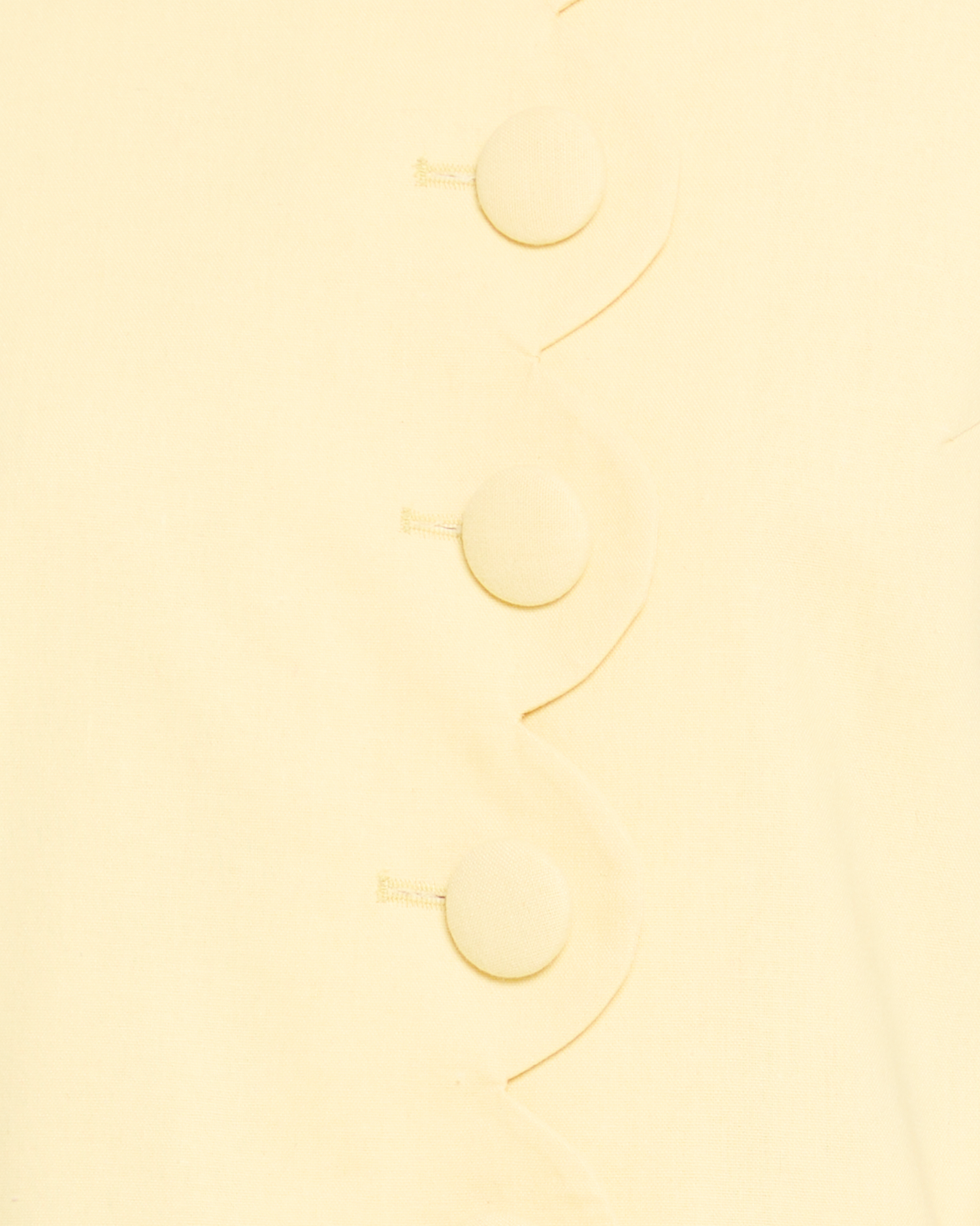 This mod-style mini is done with a gorgeous scalloped detail and oversized, covered button. Finished with functional pockets.