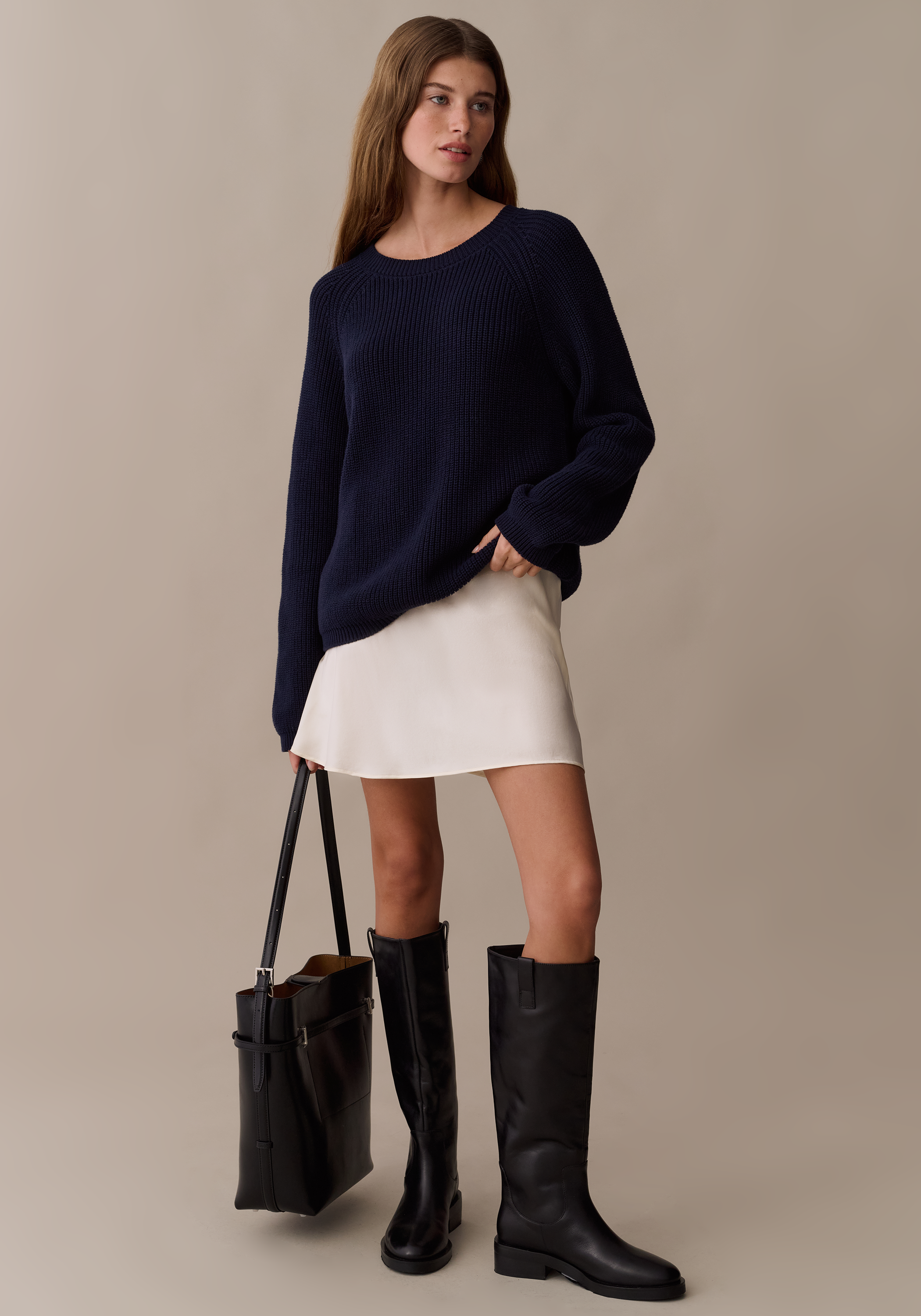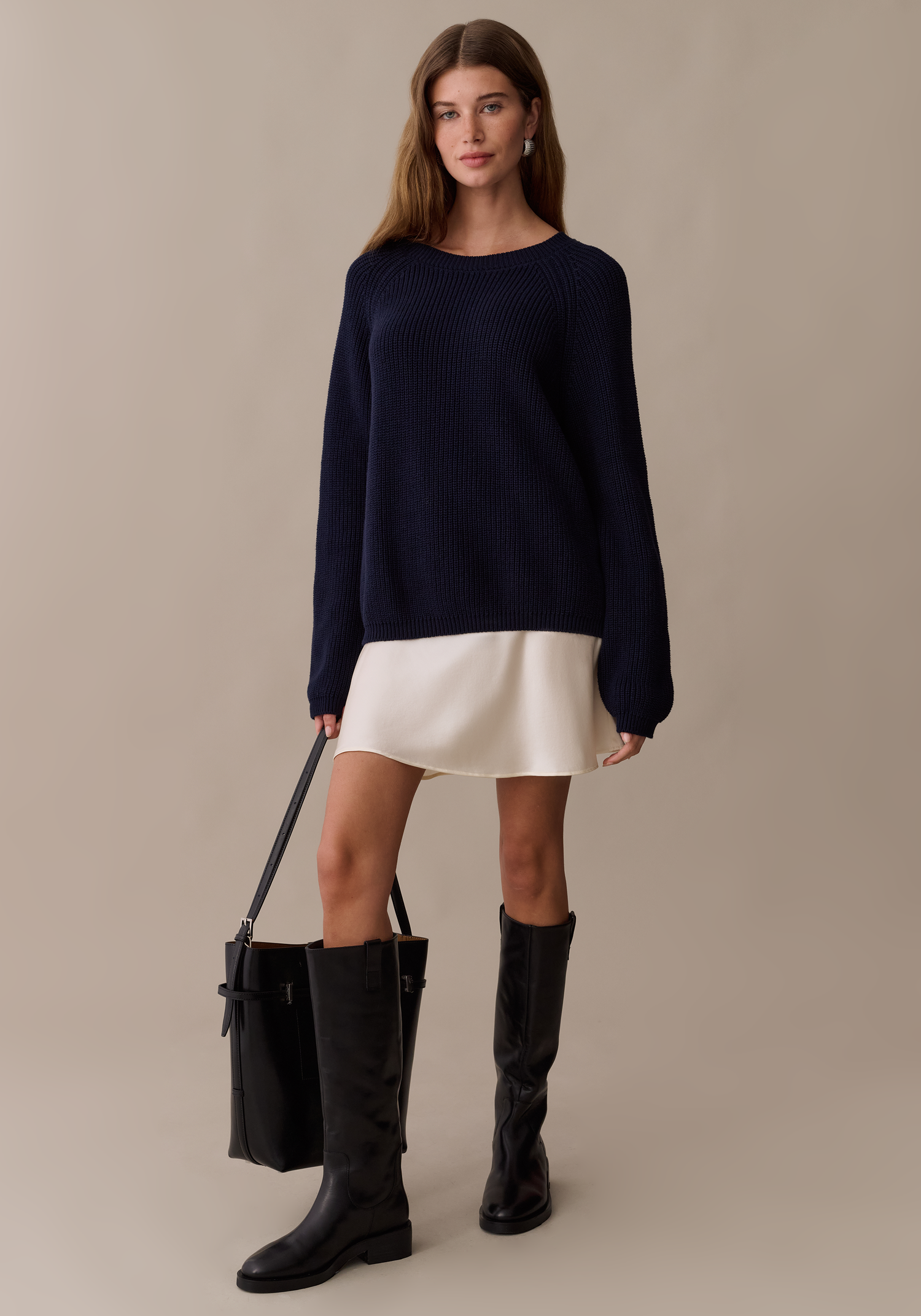 The Nyx Cotton Sweater is your go-to layering piece in a deep navy that pairs with everything. Made from soft, breathable cotton knit, it features a classic crew neck and gentle puff sleeves that add subtle shape.