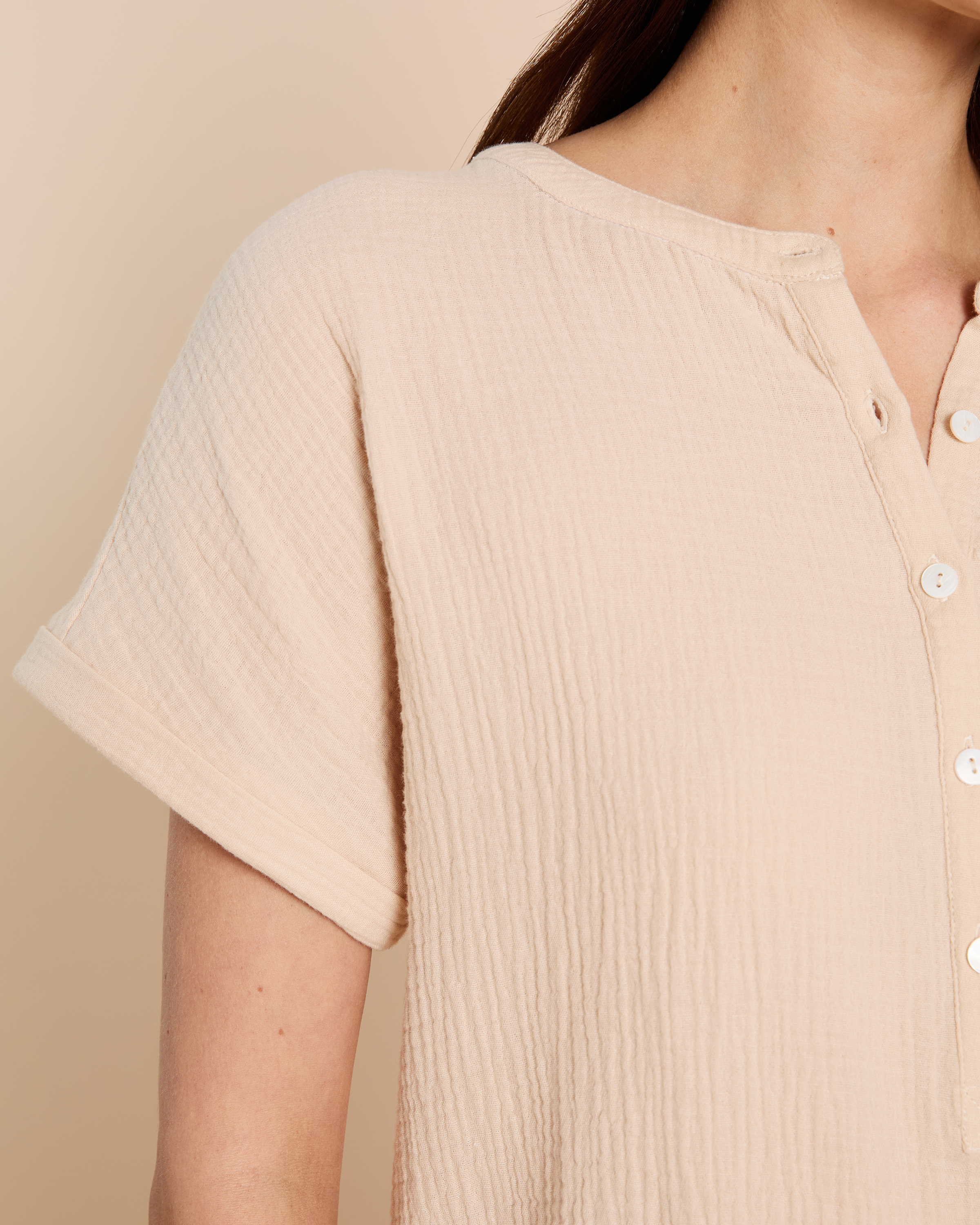 The Mae Cotton Top features functional front buttons and a textured cotton fabrication that delivers exceptional lightness and softness. Crafted with an easy, relaxed silhouette, this effortless tee offers breathable comfort while maintaining a refined look.