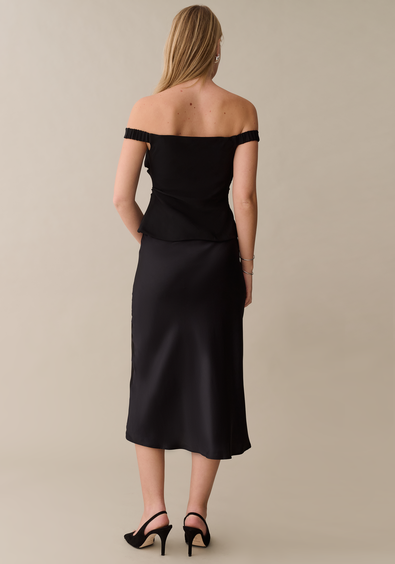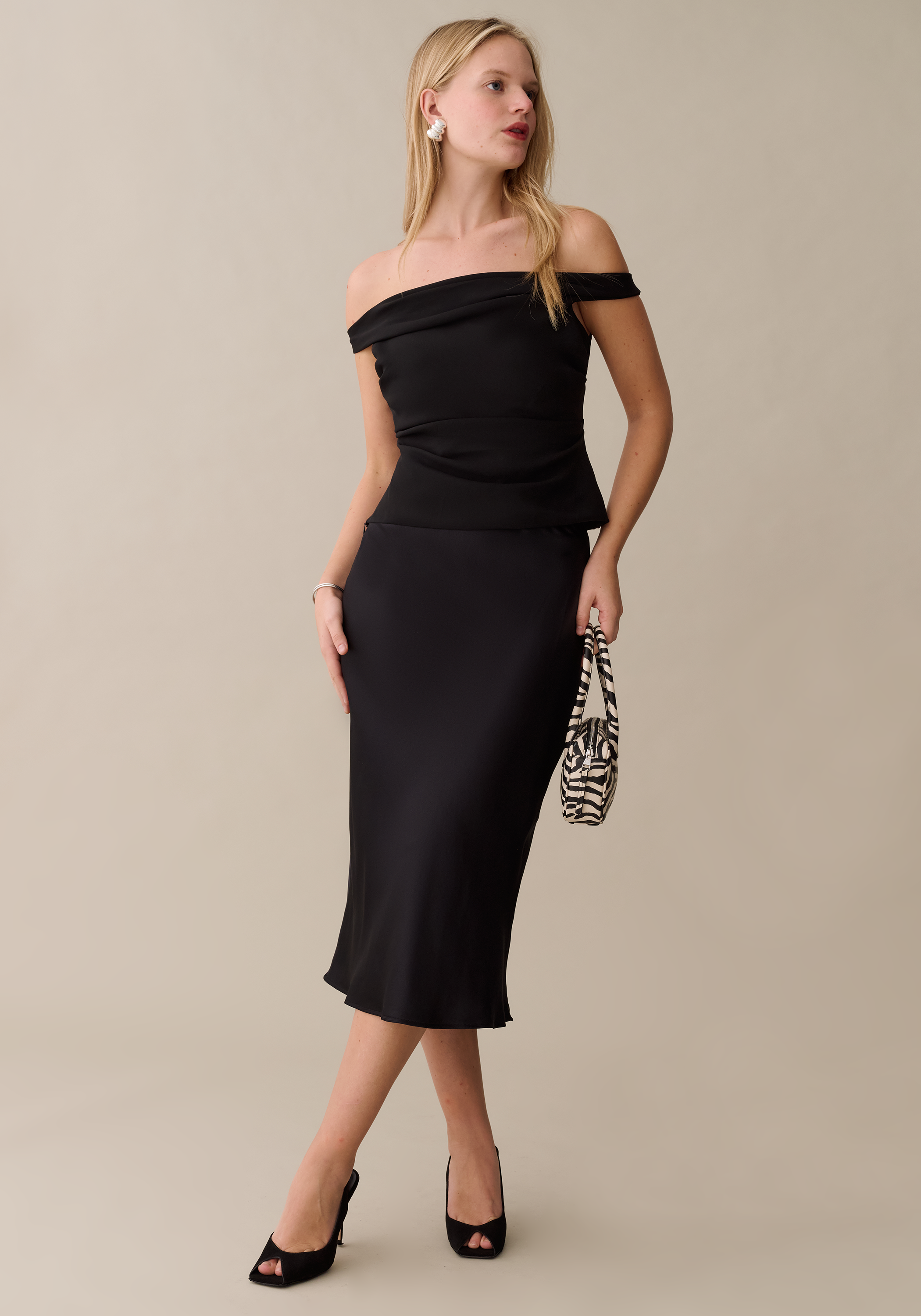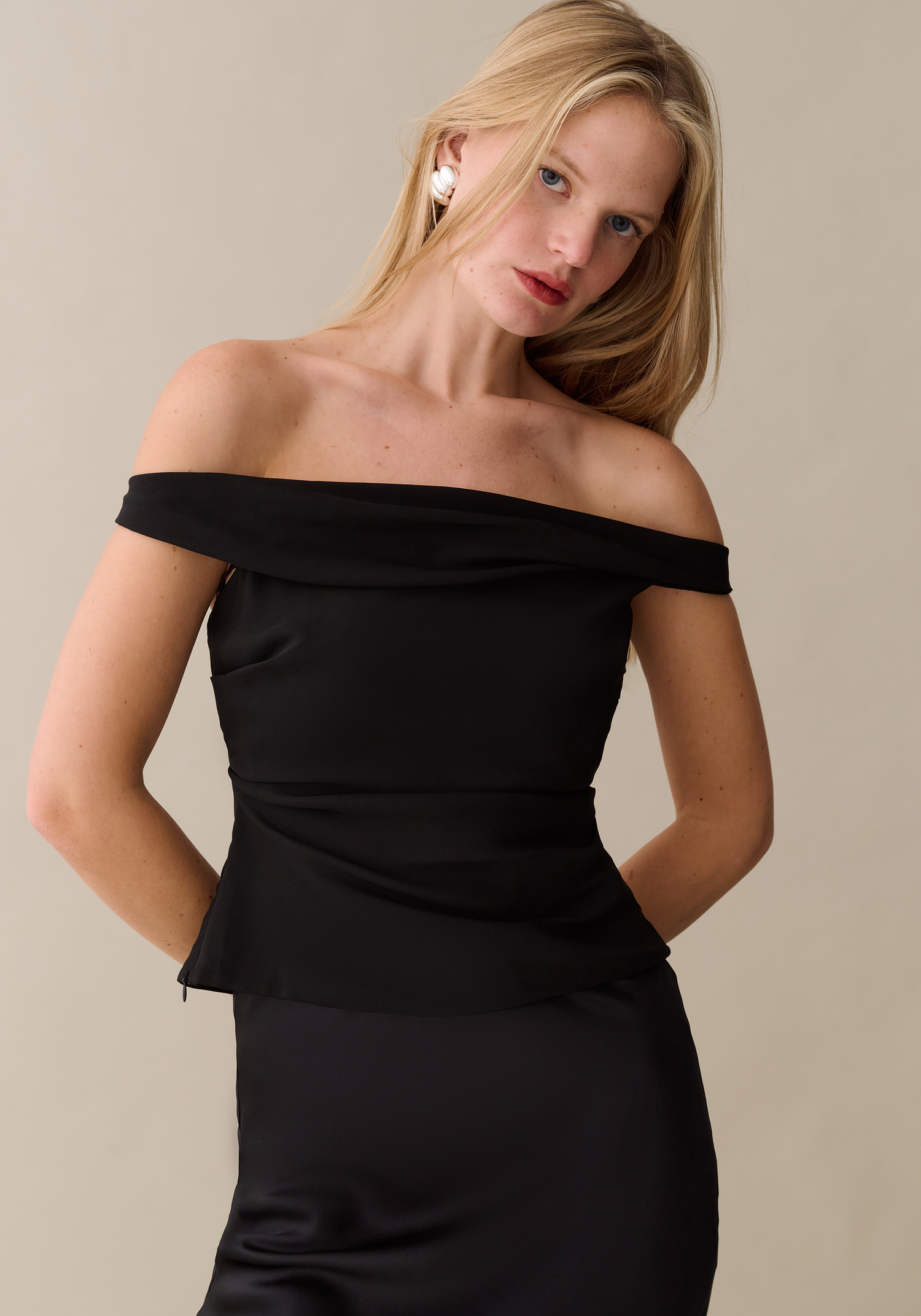 The Alina Top features an elegant off-the-shoulder design with comfortable elastic details for a secure and flexible fit. Crafted from thick, high-quality material, this fitted top offers flattering ruching that contours the silhouette, providing both style and comfort throughout the day.