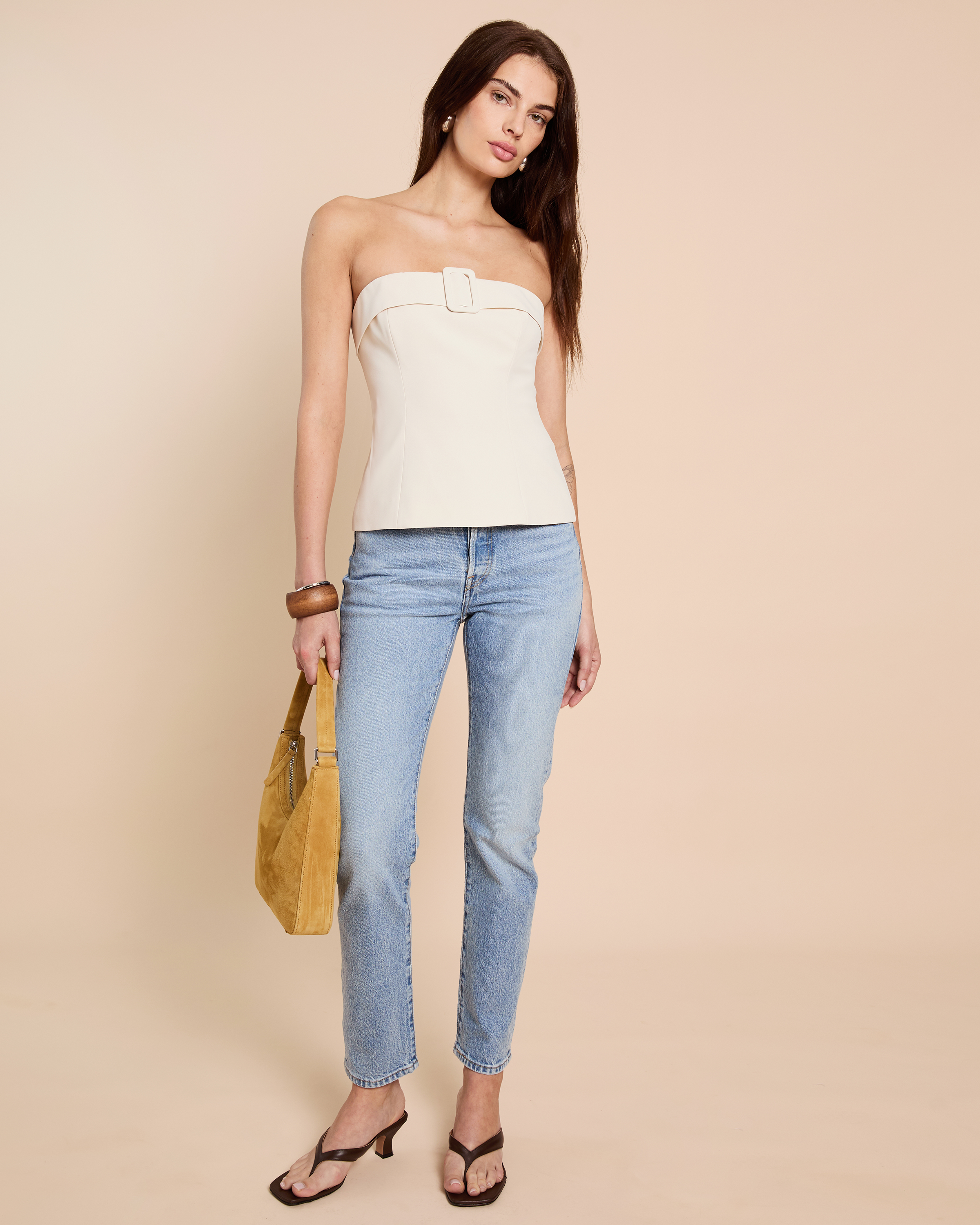 The Daye Top features a strapless design with elastic neckline for security and comfort. Its front buckle detail adds visual interest while the structured silhouette creates a refined look. Sophisticated yet effortless, this piece embodies contemporary elegance.