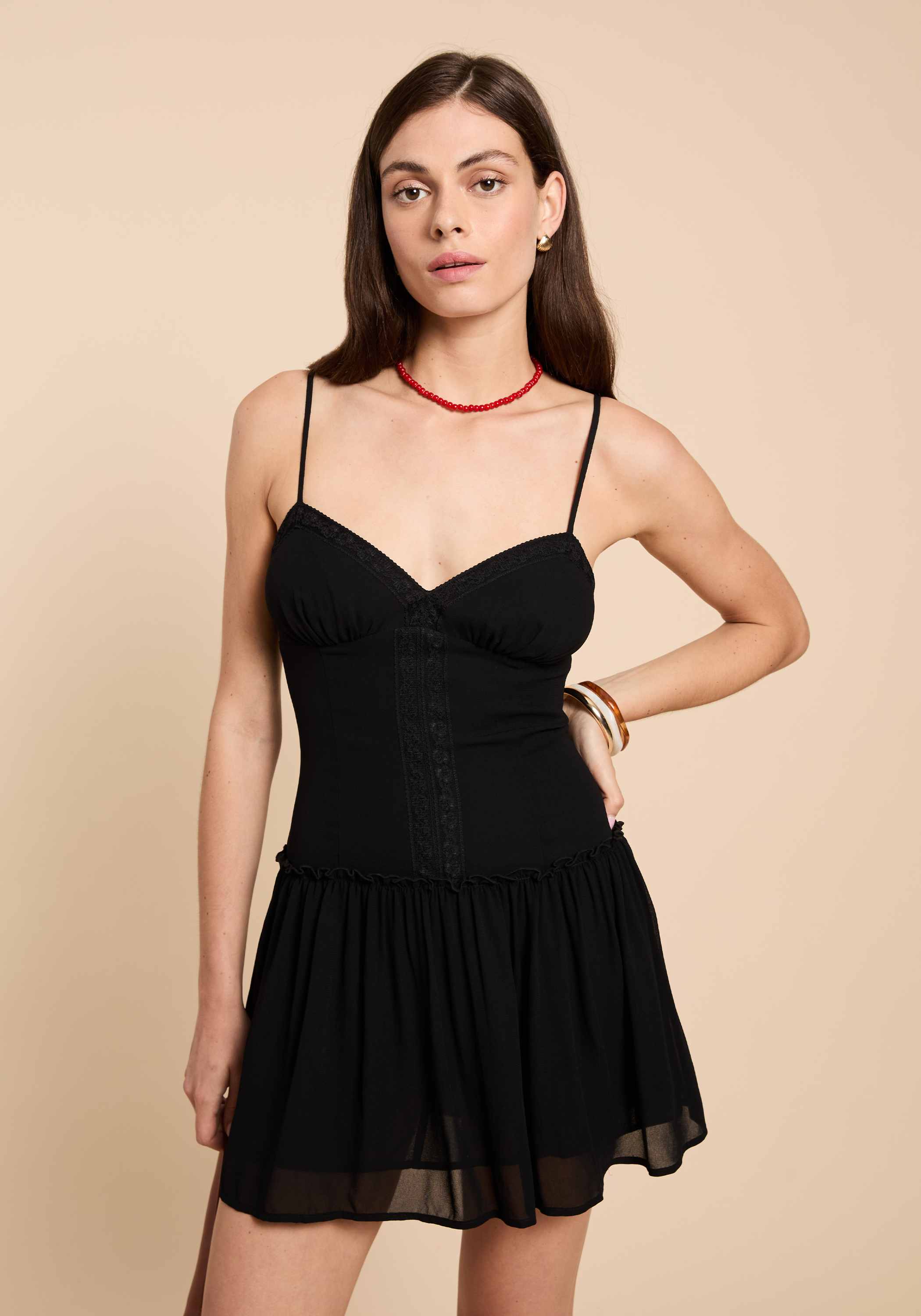 The Indi Dress showcases an embroidery-lined bodice crafted from lightweight chiffon, offering a delicate feel. Its drop waist design flows into a ruffled skirt, delivering a fun and flirty silhouette while the V-neckline and adjustable straps ensure a tailored fit.