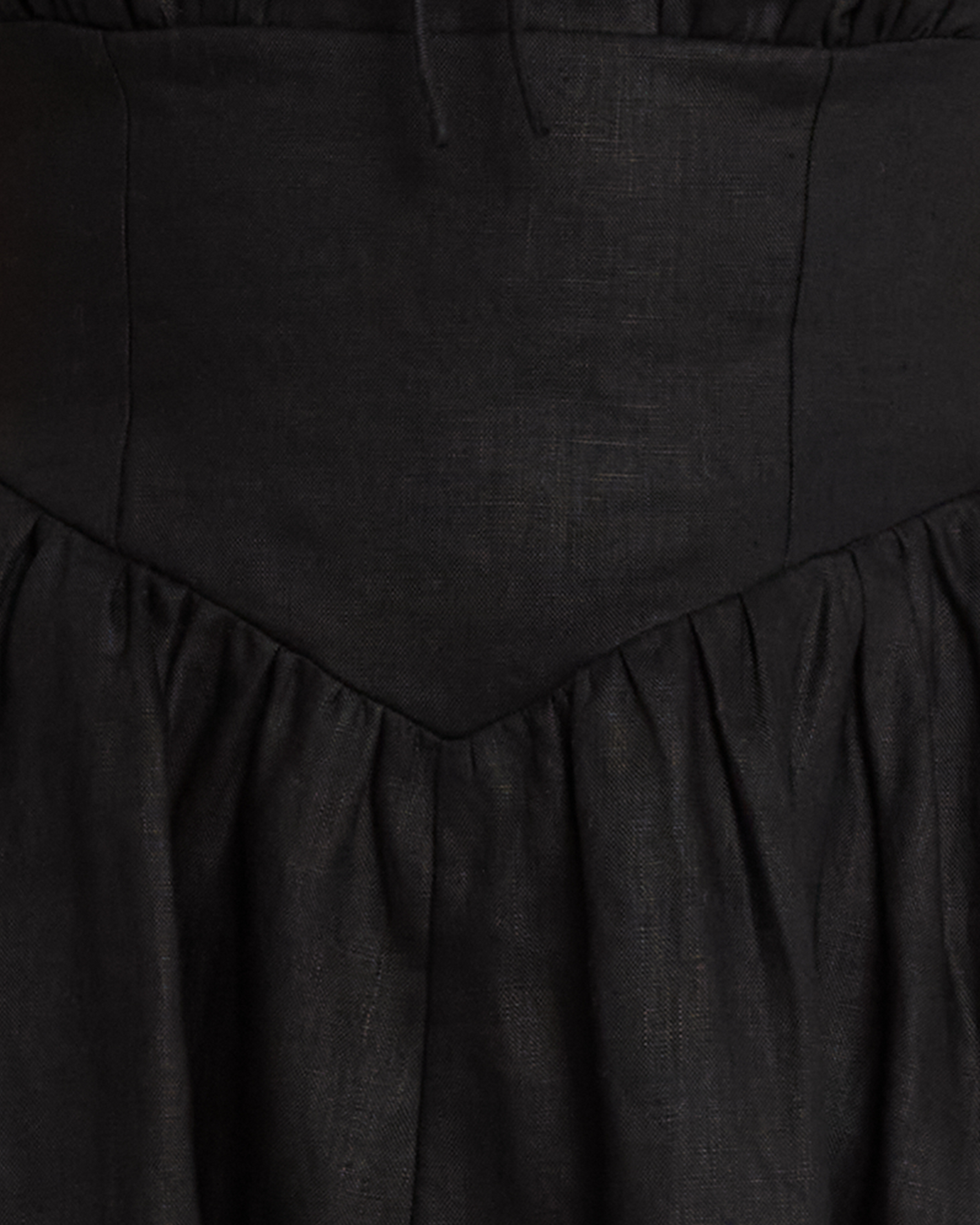 This Sierra Linen Dress features a fitted waist and ruched bust for a flattering look. The adorable bow detail and flouncy mini skirt add a touch of charm. Made from light linen, this dress is perfect for warm weather and will keep you feeling comfortable and stylish all day long.