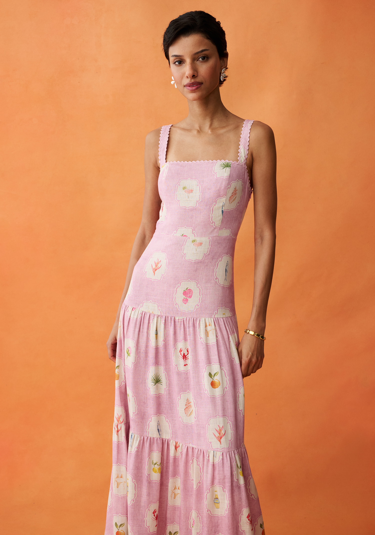 A sweet, sun-ready silhouette with a touch of vintage charm. This maxi dress features a structured bodice with trimmed straps and a softly fitted waist that falls into a tiered, easy-moving skirt. The whimsical, watercolor motif print adds a playful feel, while the lightweight fabric keeps it breezy and effortless from day to dusk.
