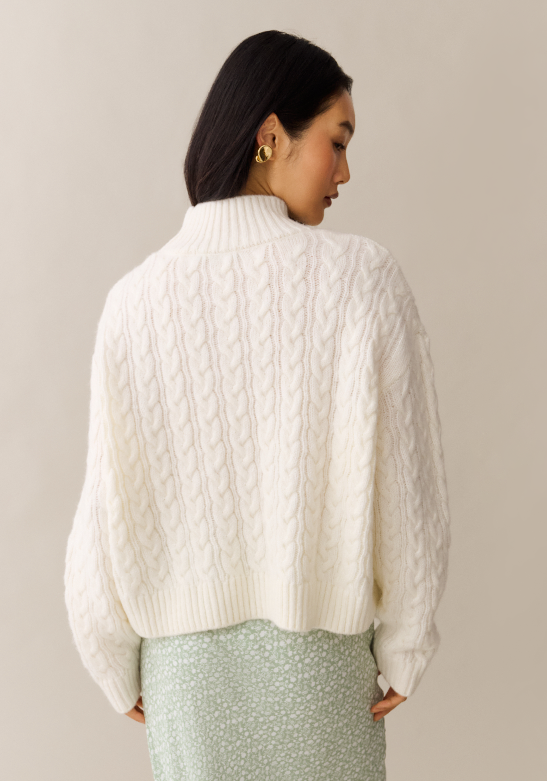 The Leonie Sweater offers a timeless cream cable knit design featuring a subtle turtleneck for added warmth and style. Crafted from a cozy wool blend, its oversized silhouette ensures comfortable layering and effortless elegance.