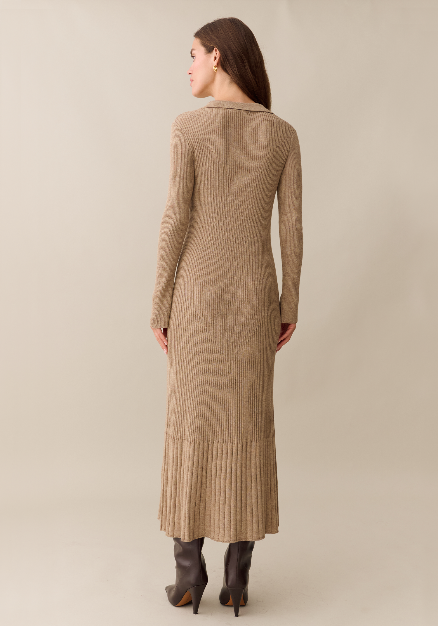 Done in an easy neutral hue, this soft sweater dress can easily be dressed up or down. Designed with a variety of ribbed knit patterns for a flattering fit and finished with a cool, collar detail.