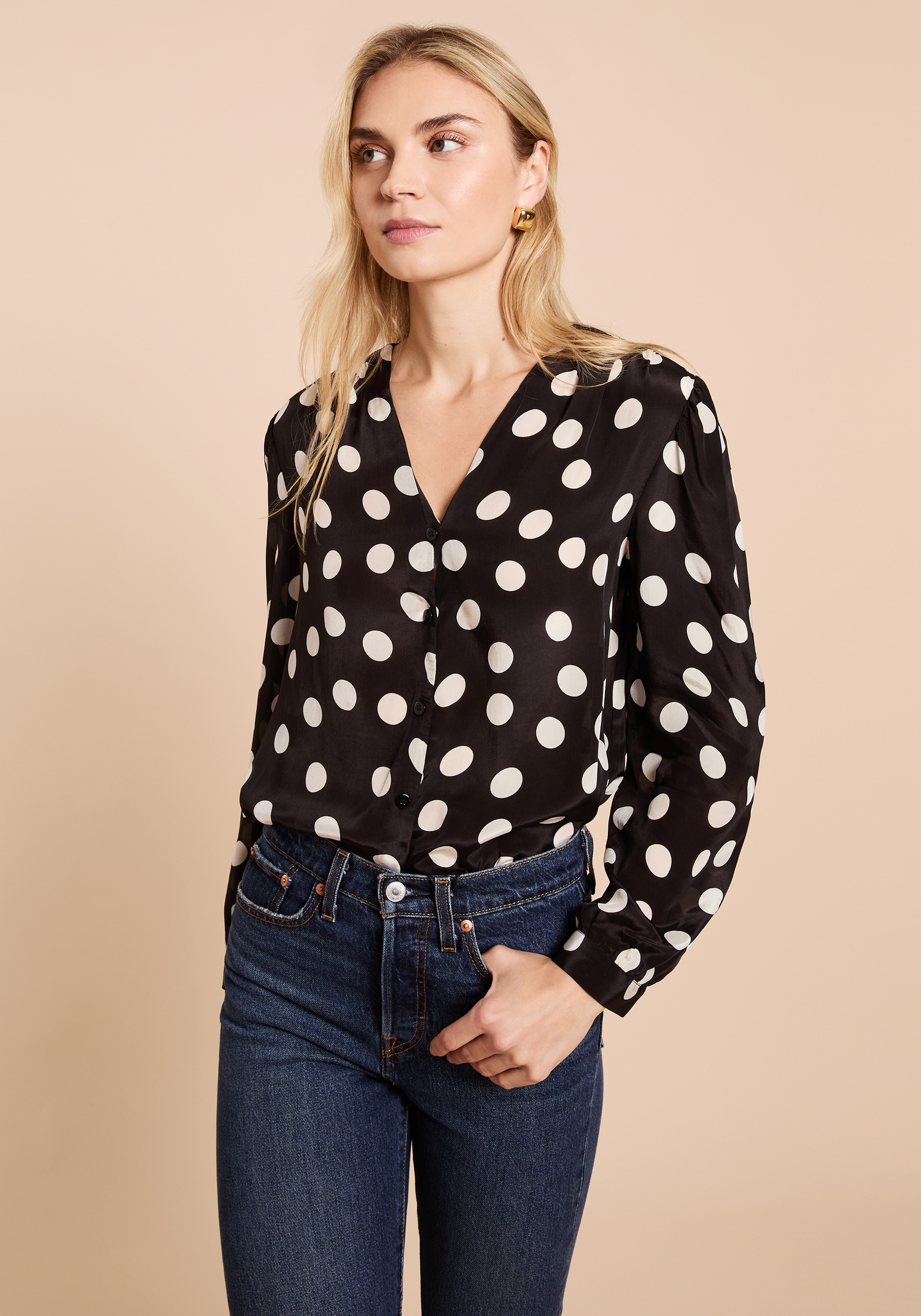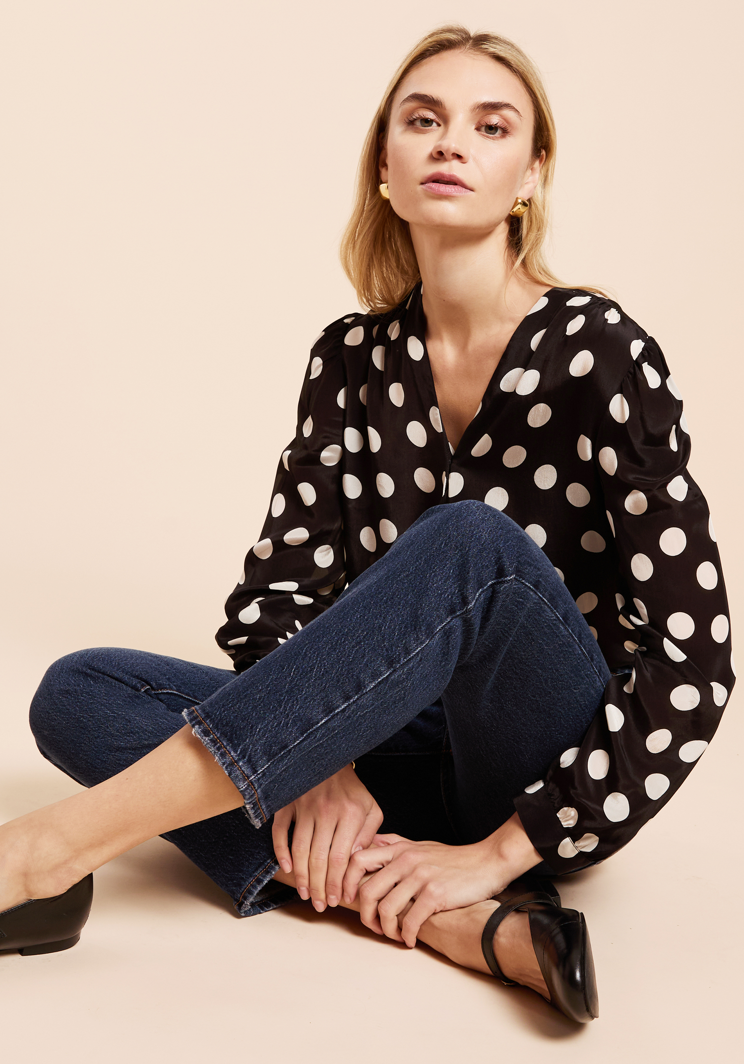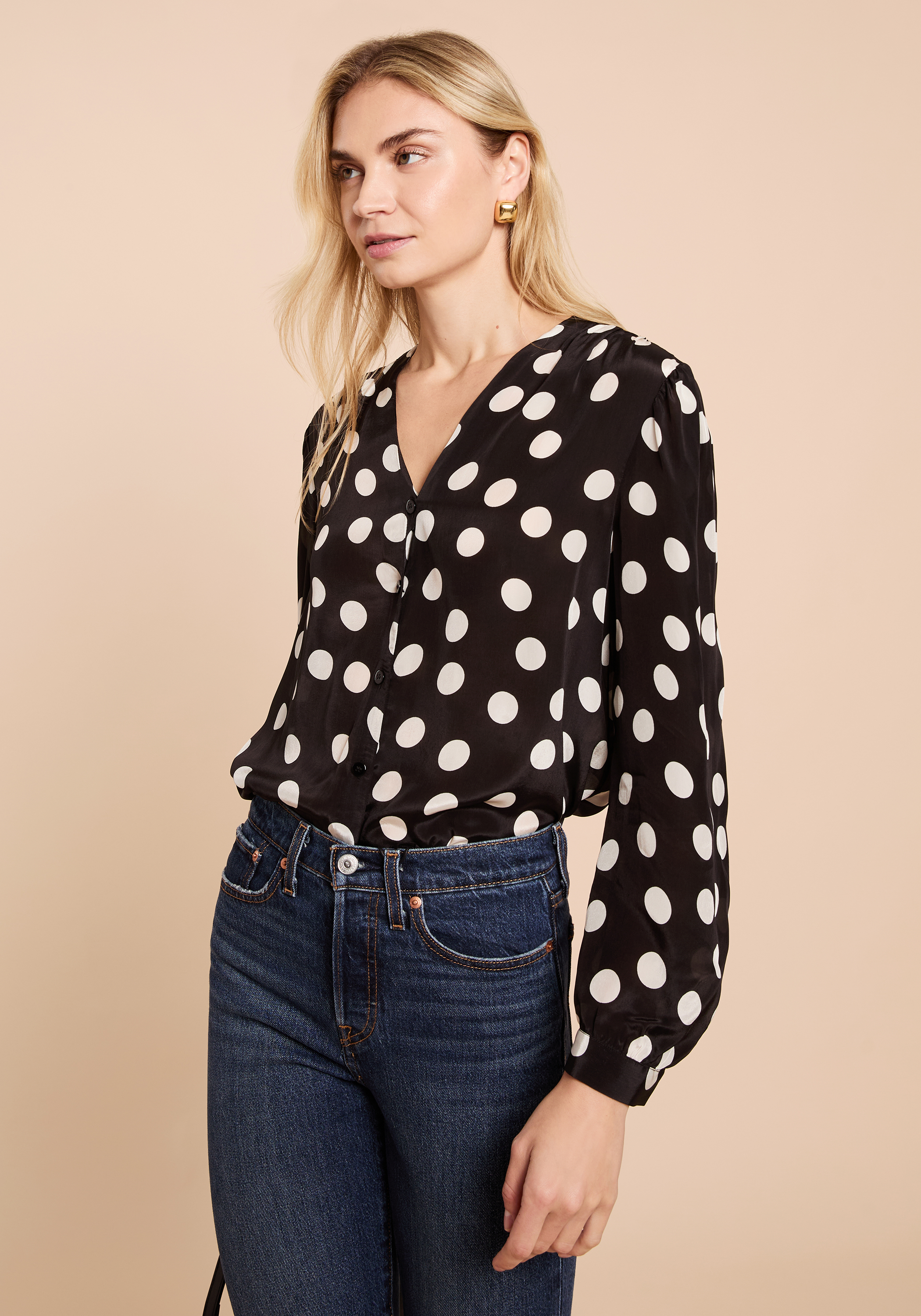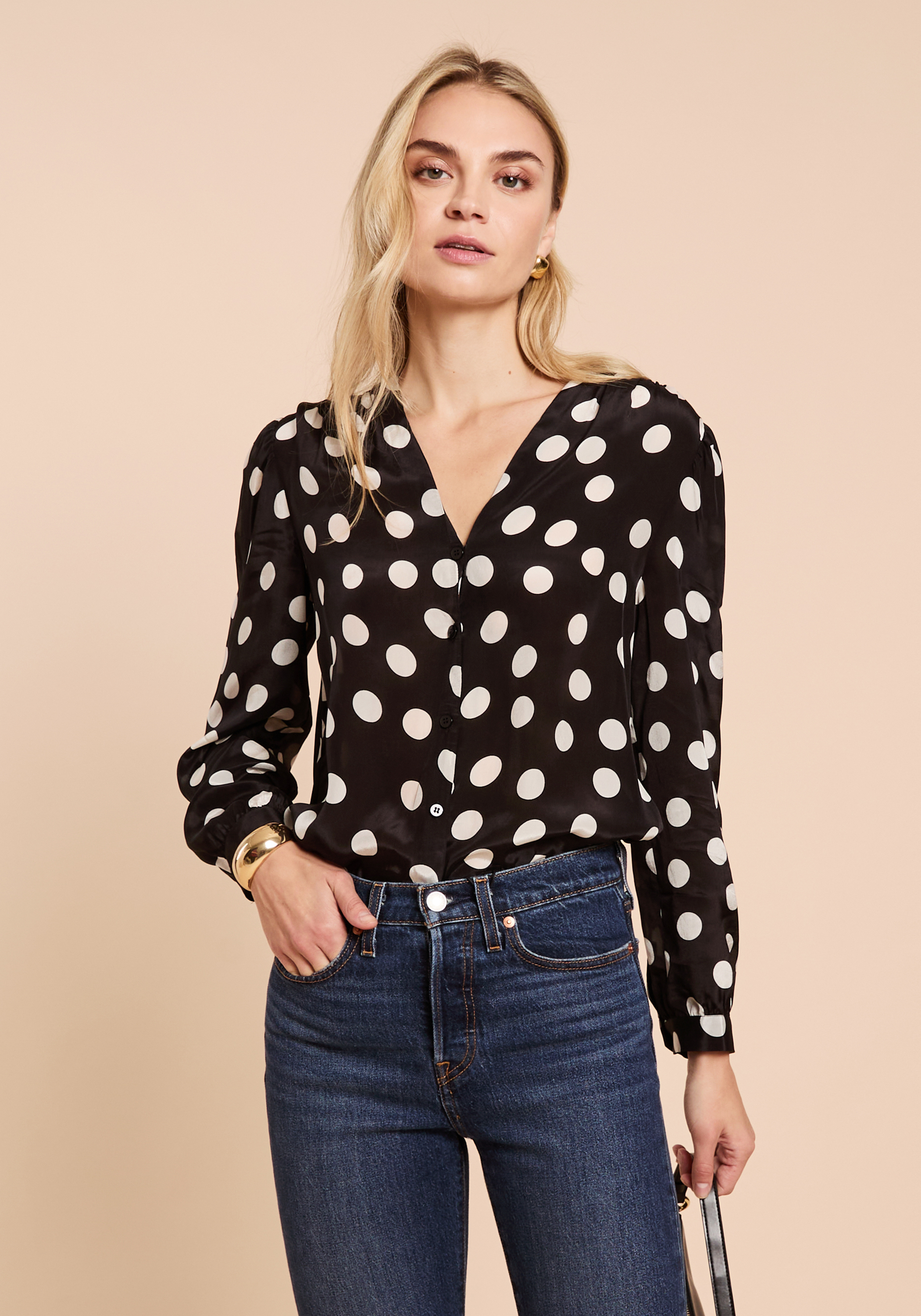 The Mima Top features a button-up design crafted from a light, silky fabric adorned with a classic polka-dot pattern. Its breathable material ensures comfort throughout the day, while the tailored fit offers a polished, put-together look suitable for both professional and casual settings.
