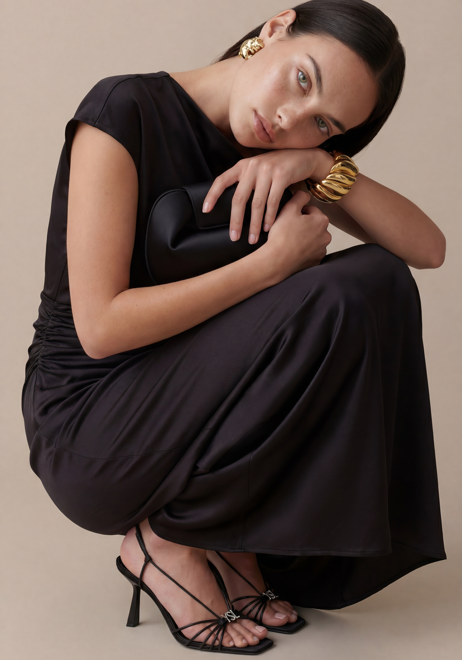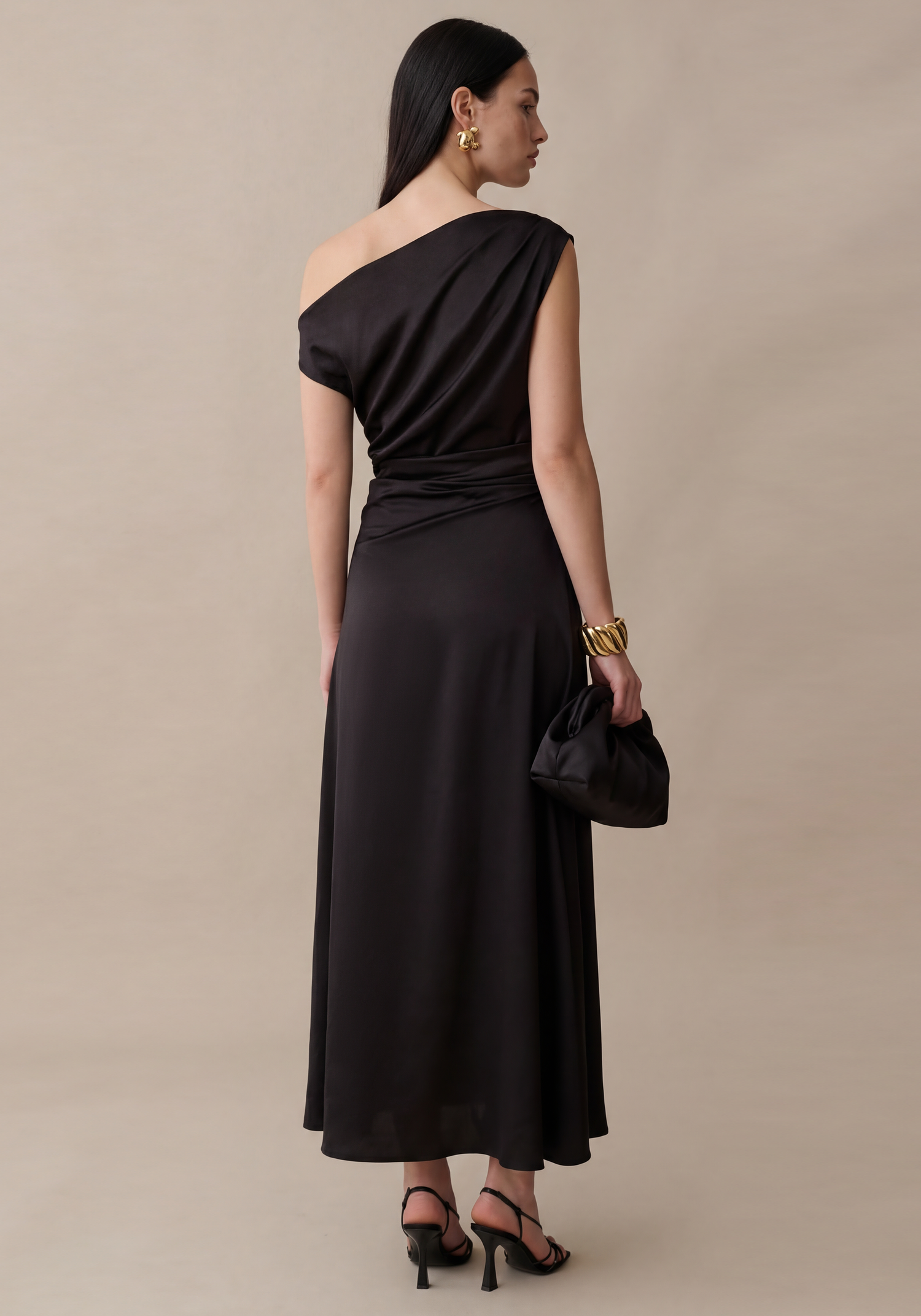 Elevate your evening look with the Ciela Dress, featuring a deep hue and silky fabric that drapes effortlessly. Its asymmetrical, off-the-shoulder design adds a touch of modern sophistication, while the fitted waist flatters your silhouette for an elegant finish.