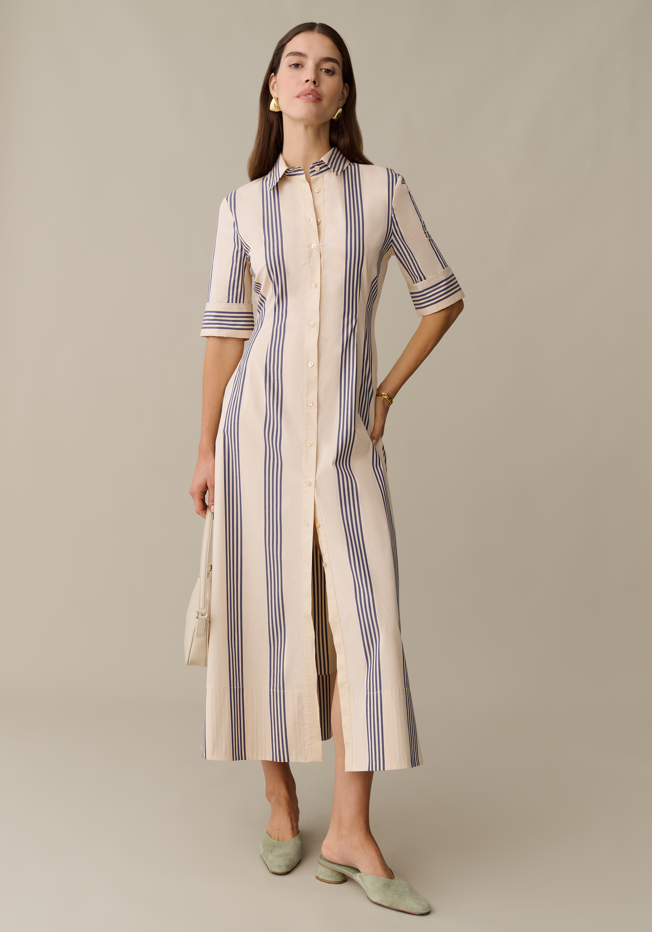 The Tallis Cotton Dress is done with a classic button-up silhouette for a look that’s both fresh and enduring. Expertly tailored with darts at the waist, it offers a flattering fit that enhances your natural shape, making it perfect for both professional and casual settings. Crafted from breathable cotton, this dress ensures comfort without sacrificing style.