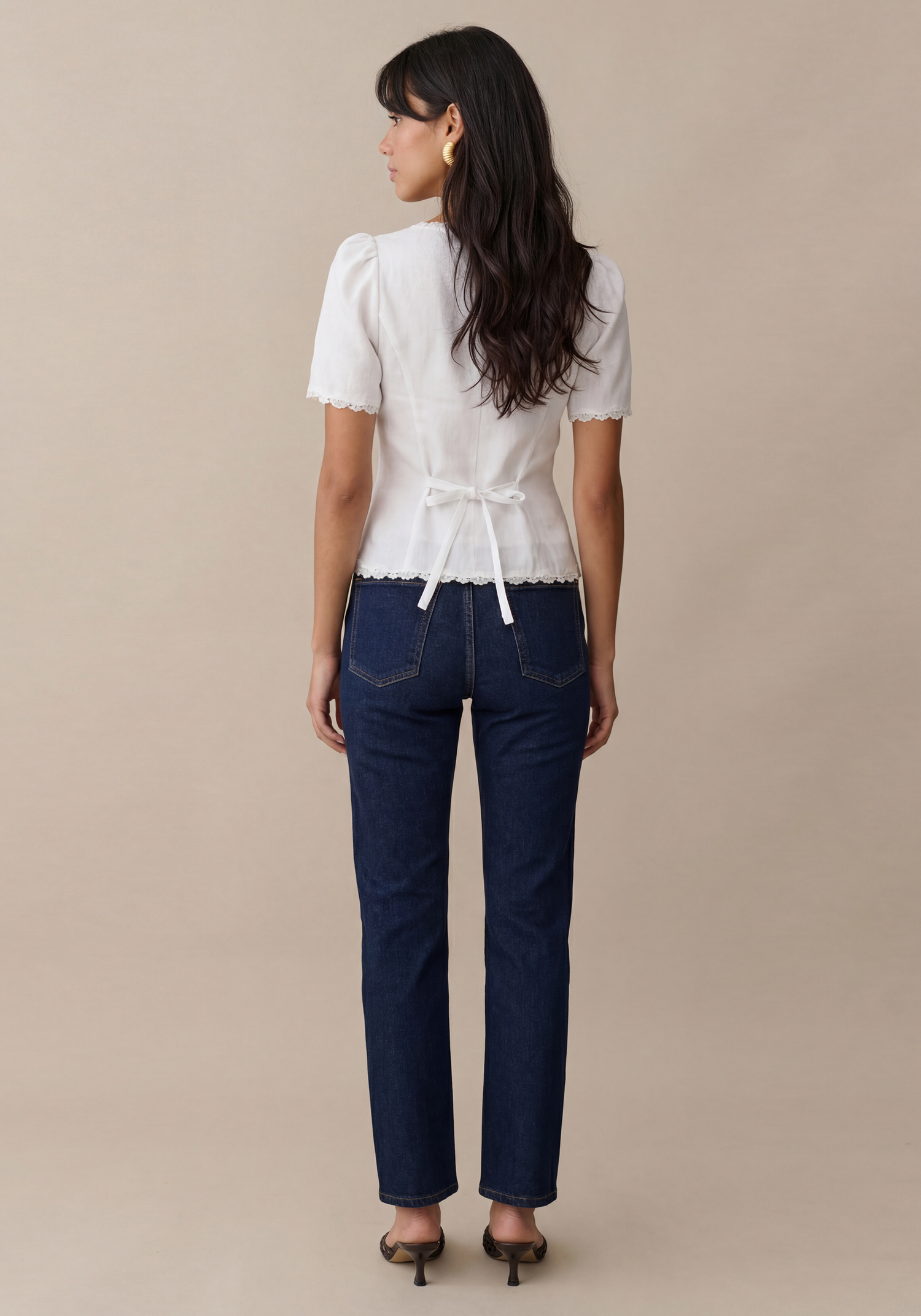 This charming blouse features delicate lace trim and front covered buttons for a vintage-inspired look. Made from lightweight linen with adorable cap sleeves, and finished with an adjustable waist tie for the perfect fit.