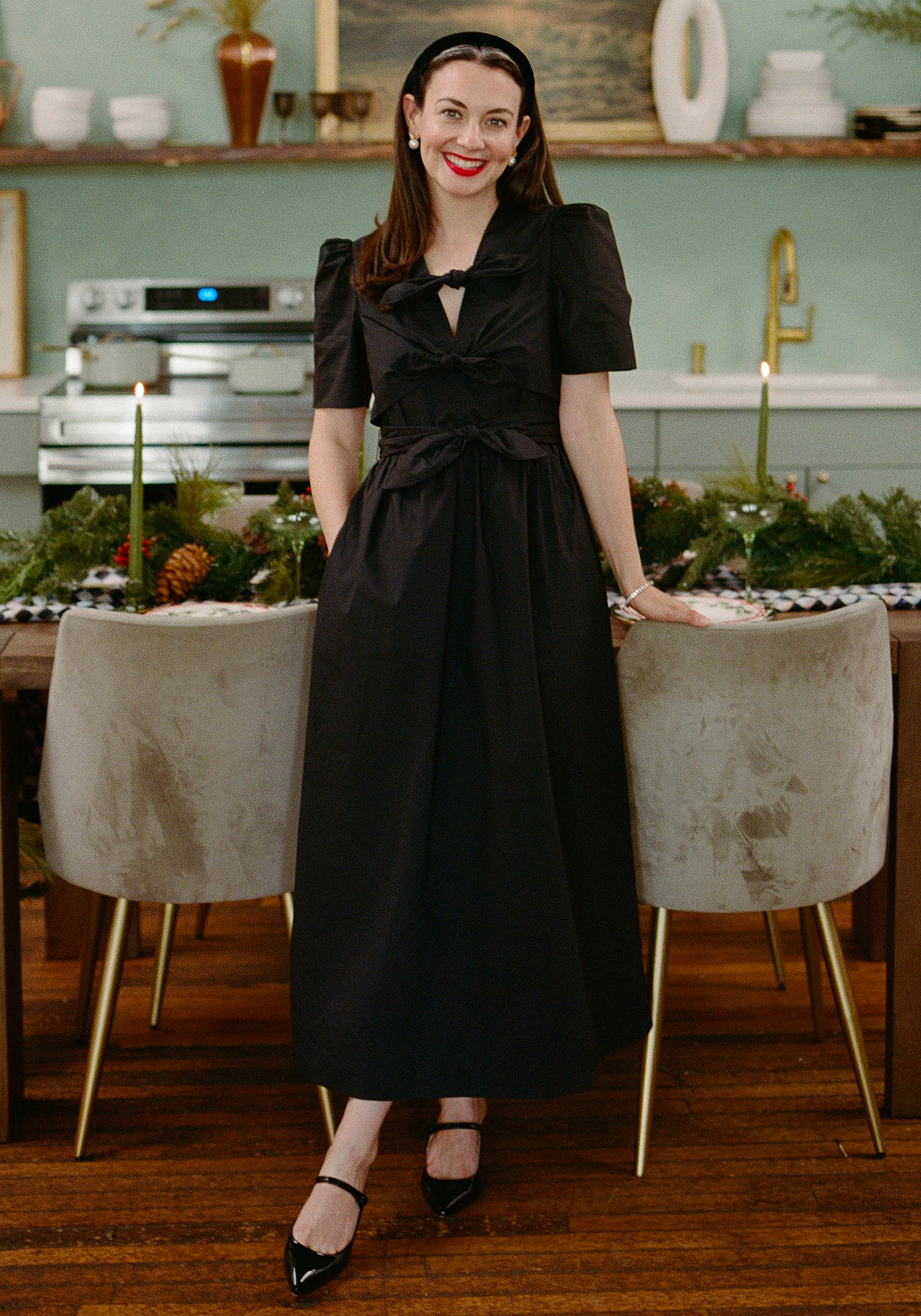This midi dress brings playful detail to a polished silhouette with three dimensional bow accents along the bodice. Soft gathers create a flattering empire shape, while short sleeves and a gently flared skirt offer ease and movement. Charming yet understated, it’s an effortless choice for both daytime events and elevated evenings.