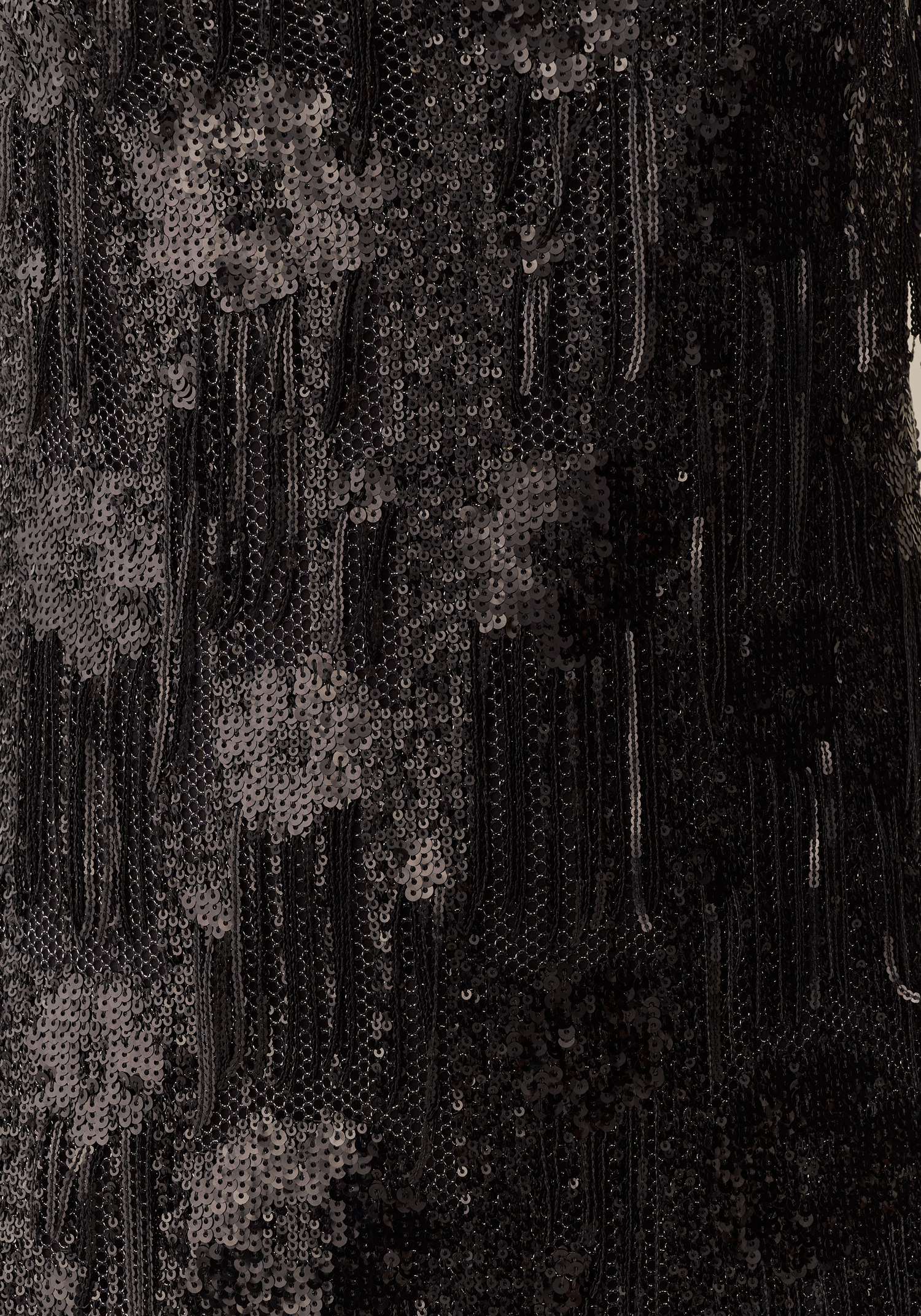 A cascade of beaded fringe and subtle sequin embroidery brings captivating texture and shine to this mini dress. The clean square neckline and streamlined silhouette offer balance, while the side slit adds a touch of movement and ease. Designed for dancing and memorable nights, it delivers high-impact glamour with modern poise.