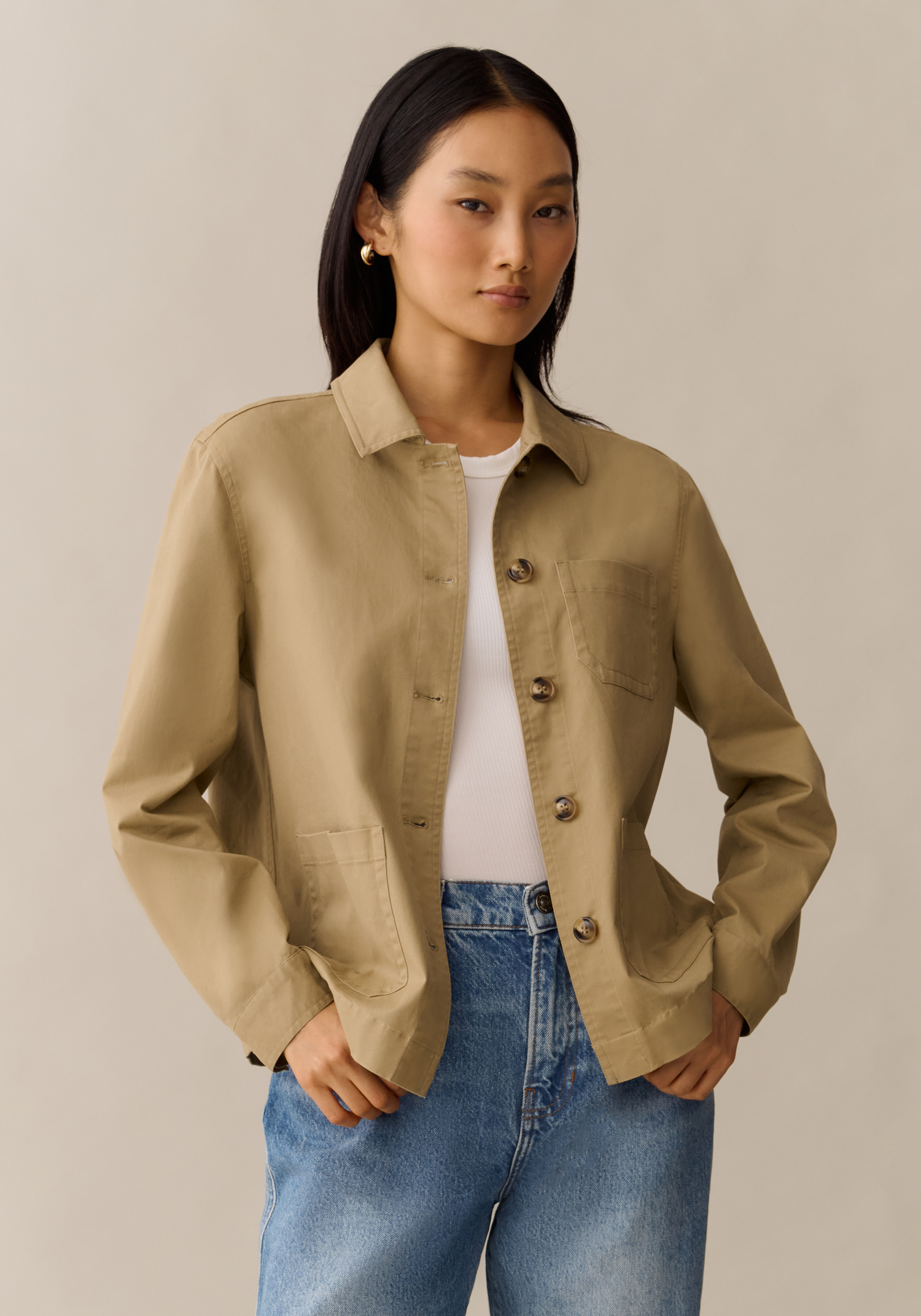 The Estelle Jacket offers an easy, effortless classic layer crafted from a lightweight cotton blend for comfortable wear. Featuring a clean collar and front buttons, it combines timeless style with practical design, making it a versatile addition to your wardrobe.