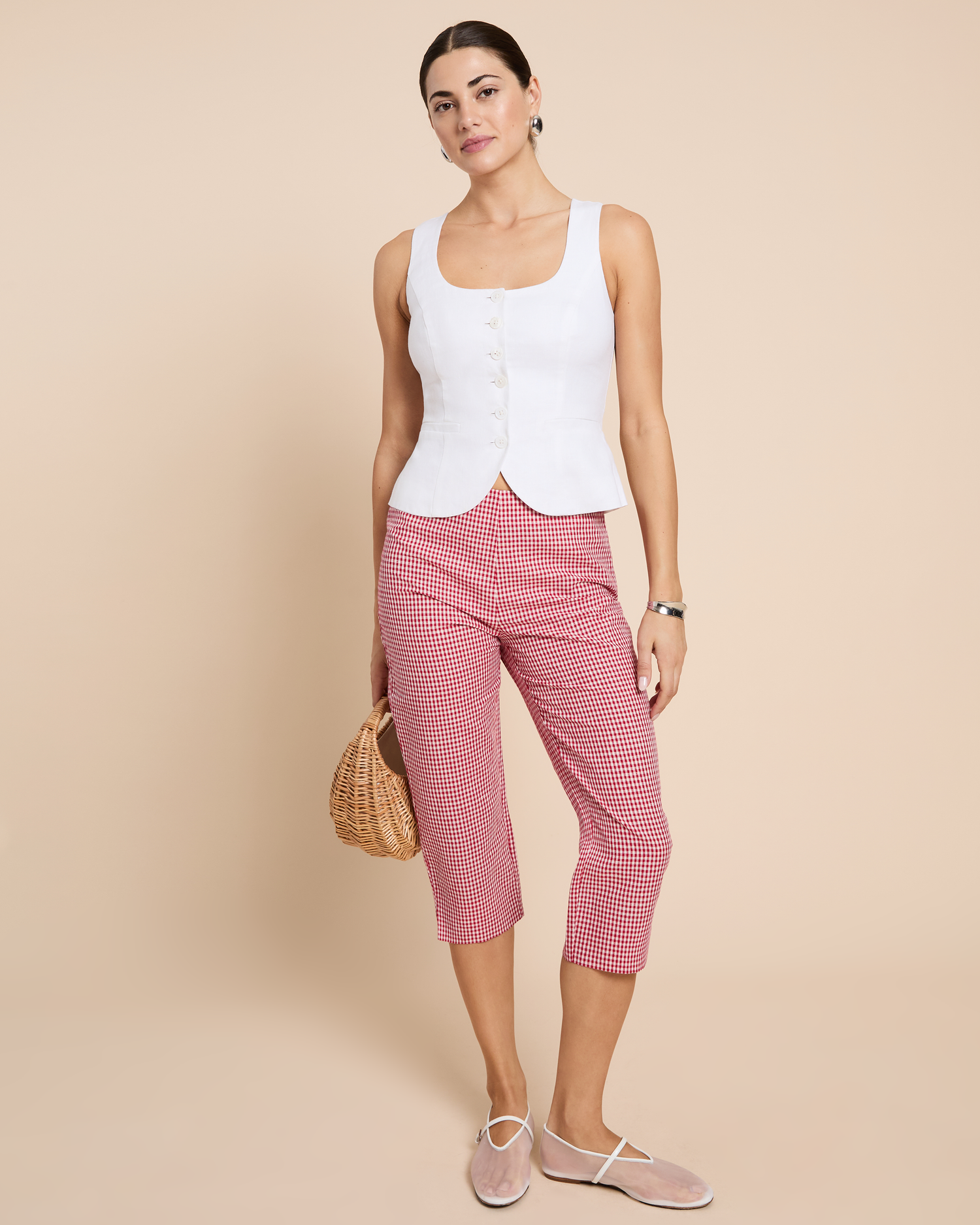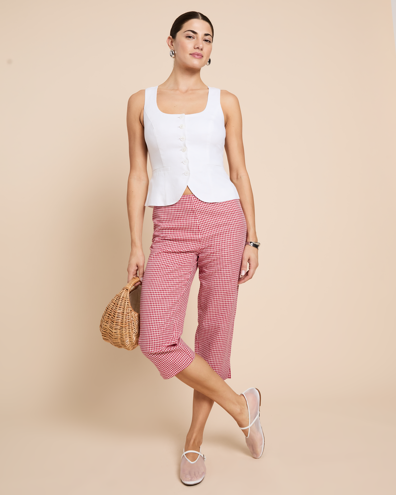 Expertly crafted with a linen-cotton blend, the Beyonca Capri offers a flattering high-waisted fit and fun gingham print. Perfect for adding a charming touch to any outfit we love this comfortable and stylish capri.