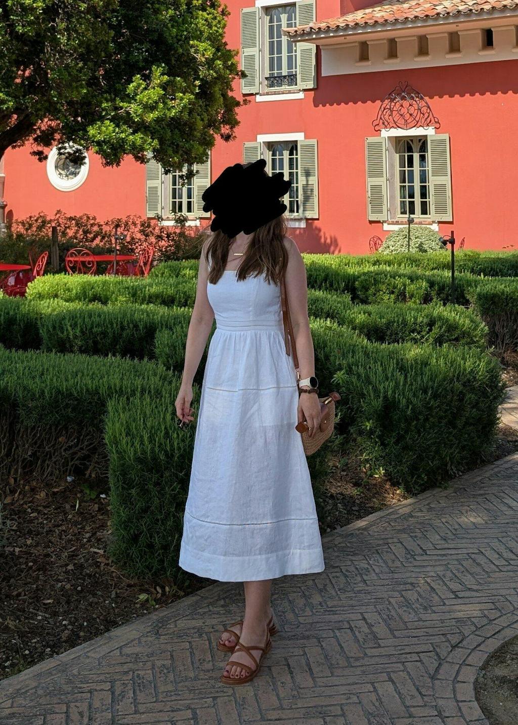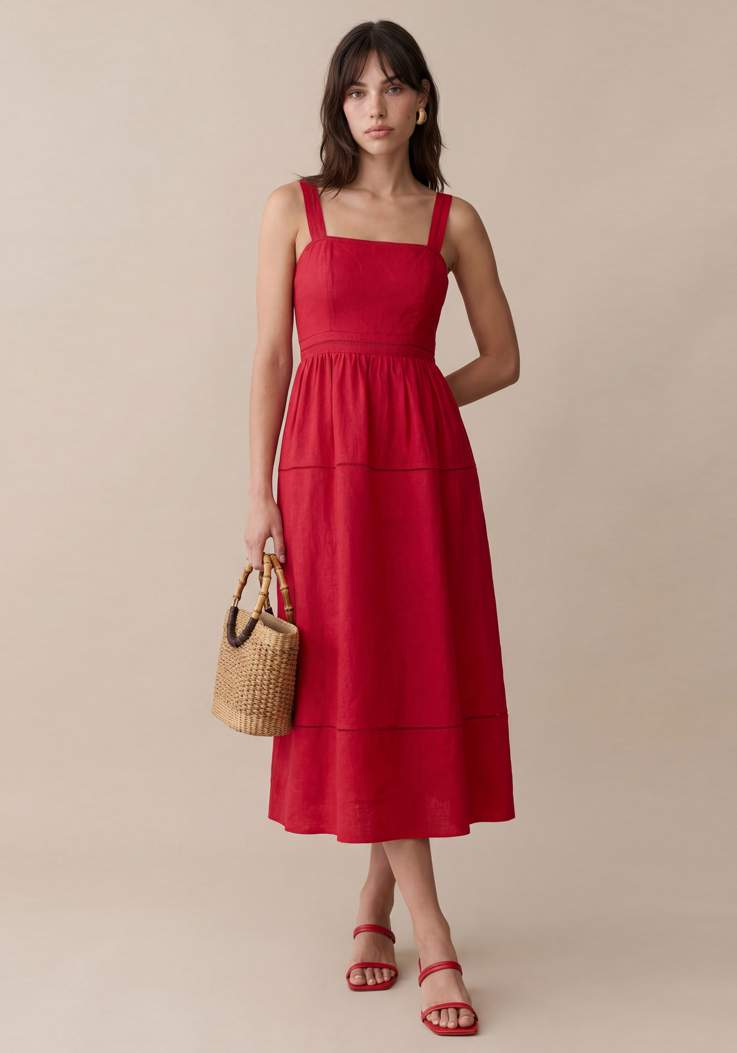 Expertly designed with a fresh linen material, the Ridley Linen Dress boasts a clean and simple design. With a straight neckline and delicate trimming details on the skirt, this dress is perfect for a special occasion or everyday.