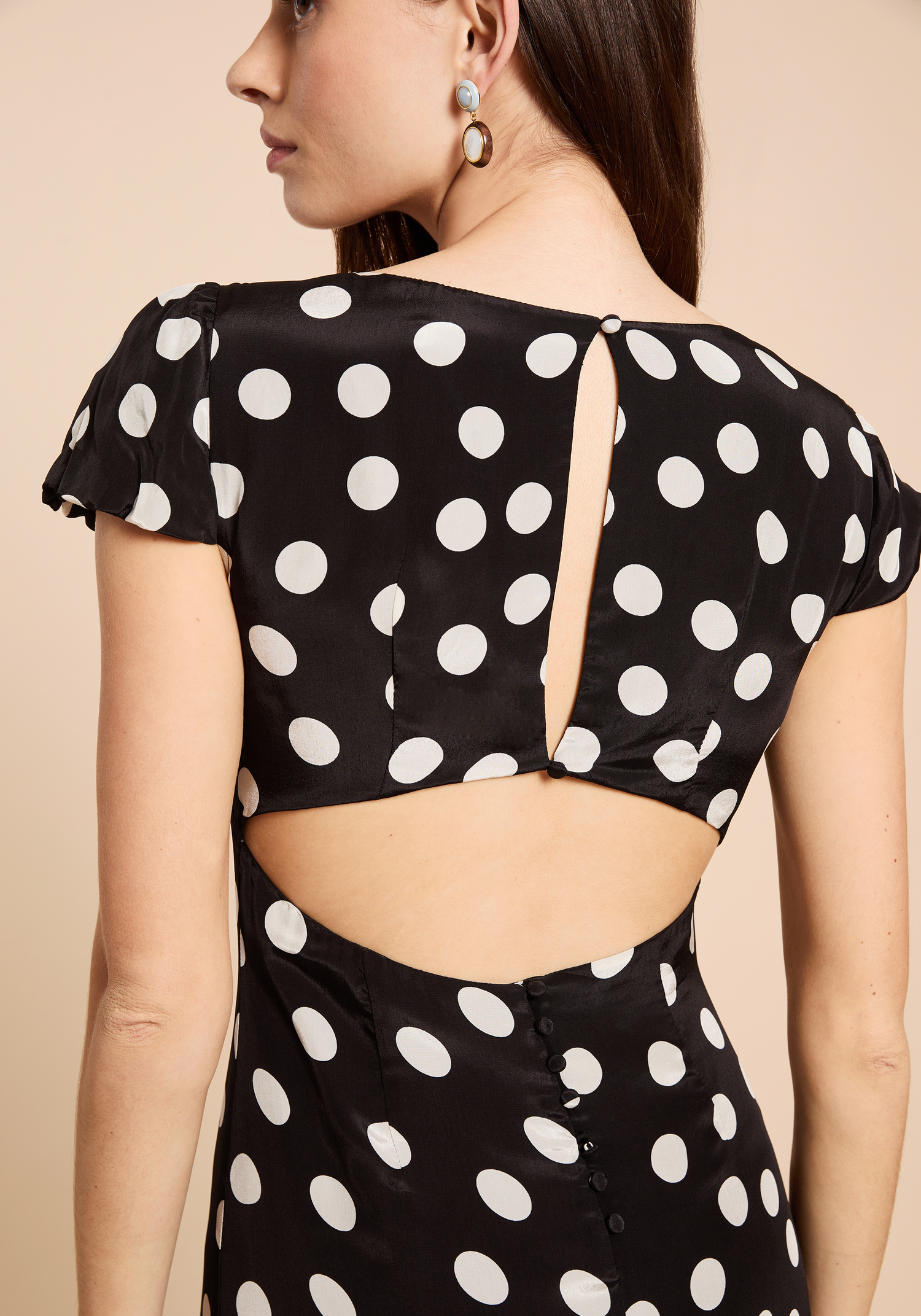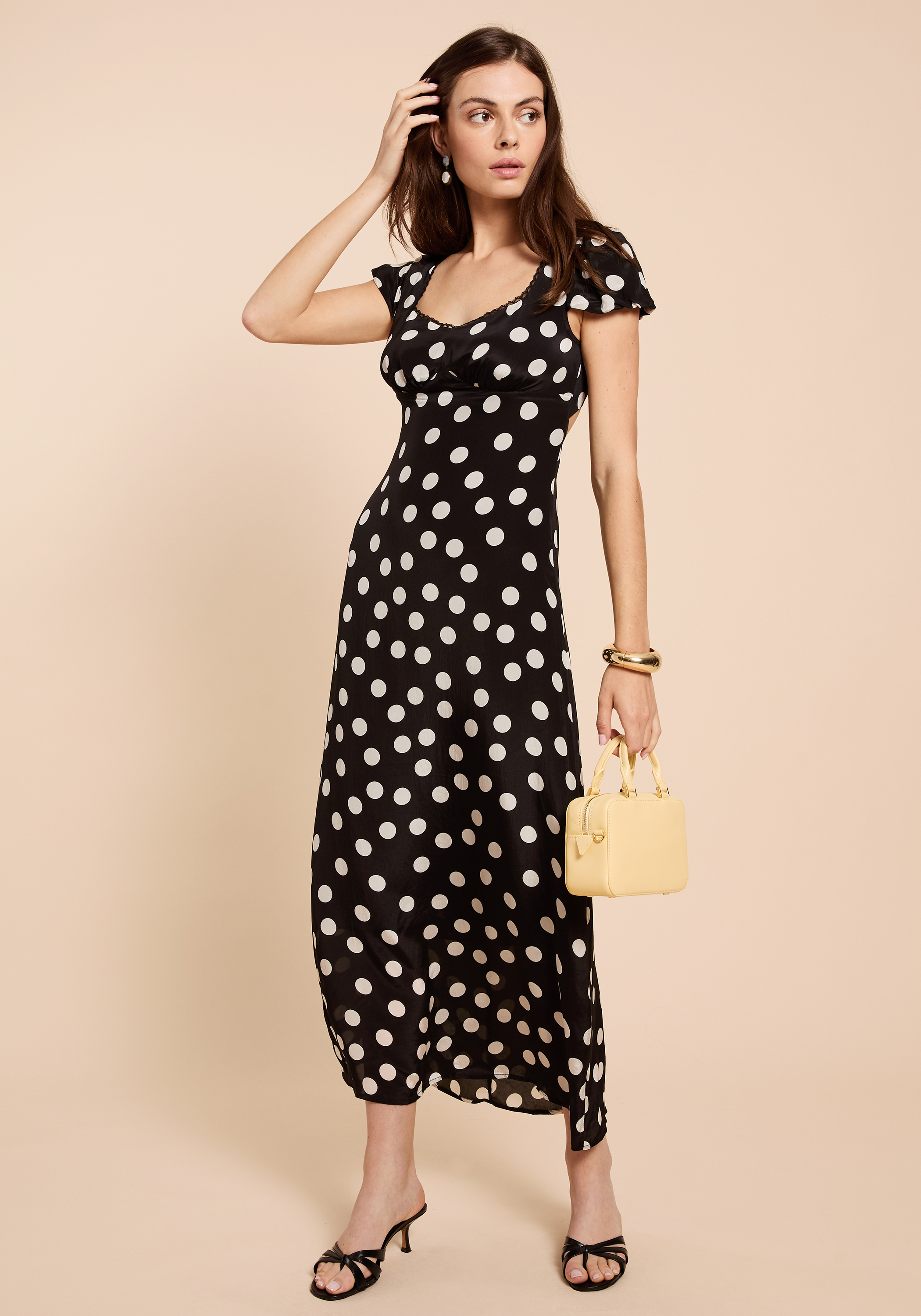 The Zarina Dress showcases delicate cap sleeves and elegant lace trim. Its playful polka dot print adds a lively, vintage-inspired charm, while the open back detail provides a sophisticated and modern twist. This expertly crafted dress perfectly balances timeless elegance with contemporary design.
