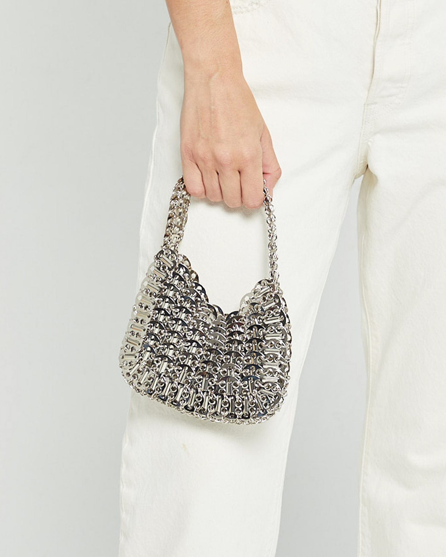 Modern and cool, this bag is uniquely constructed from woven metal plates. Amn easy way to add some shine to any outfit.