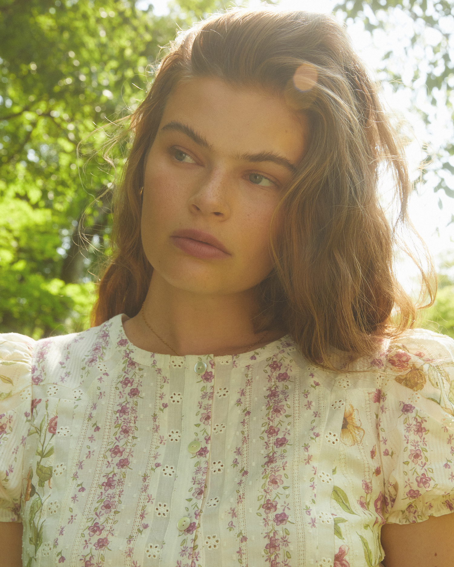 The Fiora Cotton Dress combines a refined high neckline with charming short puff sleeves for a delicate silhouette. Its paneled bodice offers structured elegance, complemented by a soft, feminine floral print that creates a romantic and dreamy look.