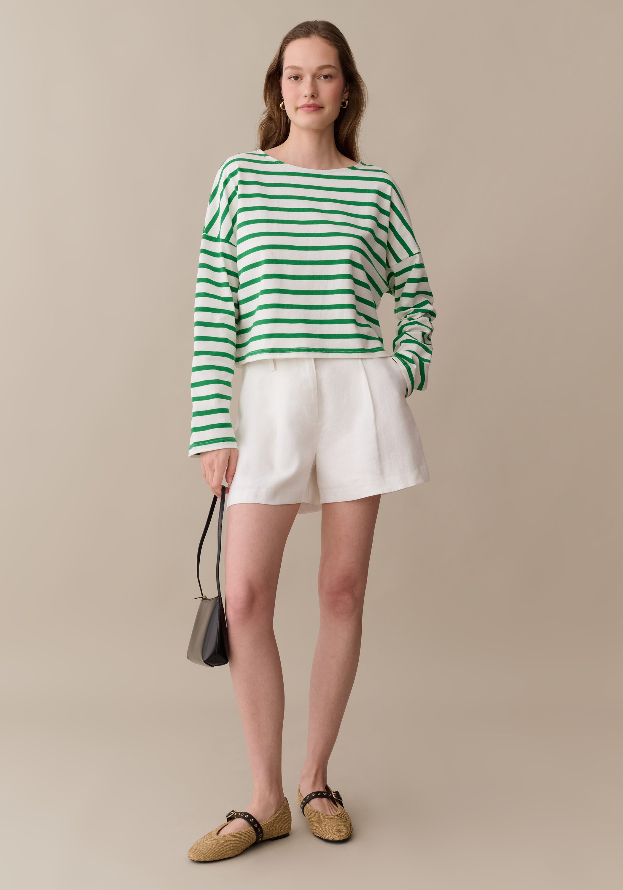 The Scout Cotton Top brings effortless style with its fun green striped pattern and relaxed silhouette. Crafted from soft cotton, the slightly cropped hem hits just right for a laid-back vibe. Perfect for throwing on and looking put together without trying.