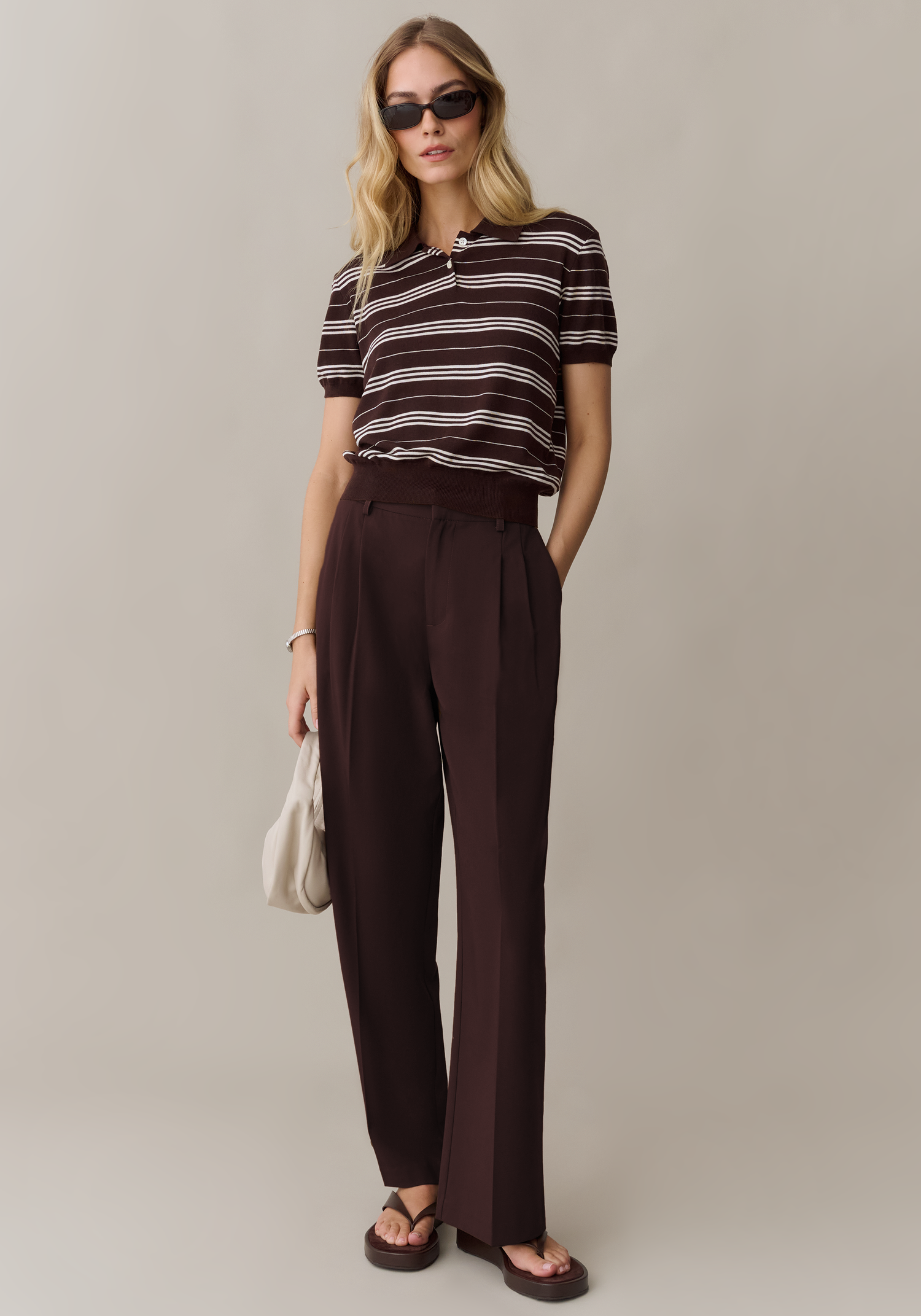 The Tate Top combines a classic button collar with short sleeves and eye-catching stripes and a rich brown hue. Its timeless design works effortlessly across casual and polished looks, making it a versatile wardrobe staple that pairs with anything.