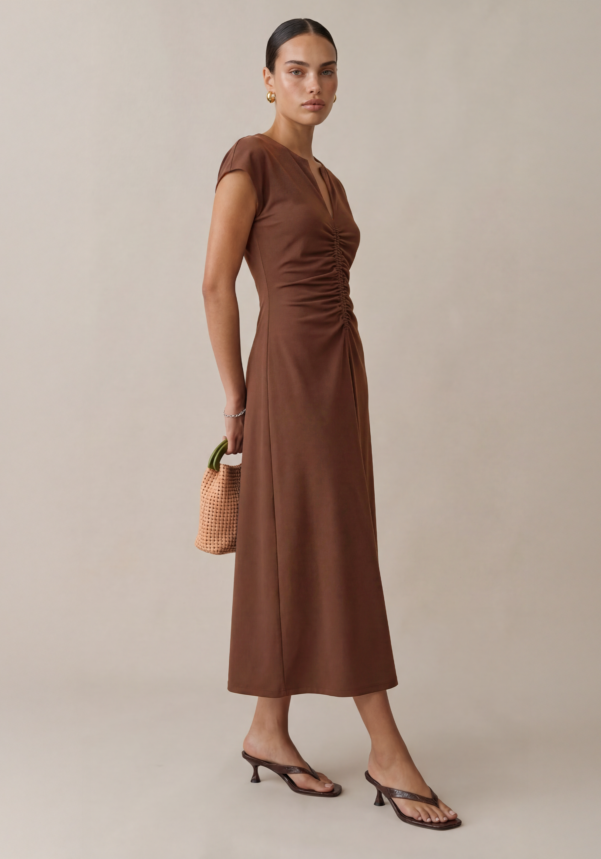 The Roxy Cotton Dress features strategic front and back ruching that flatters your figure, paired with an adjustable front zipper for customized fit. The mid-weight, stretchy fabric moves with you, offering comfort without compromise. Effortless elegance for everyday wear.
