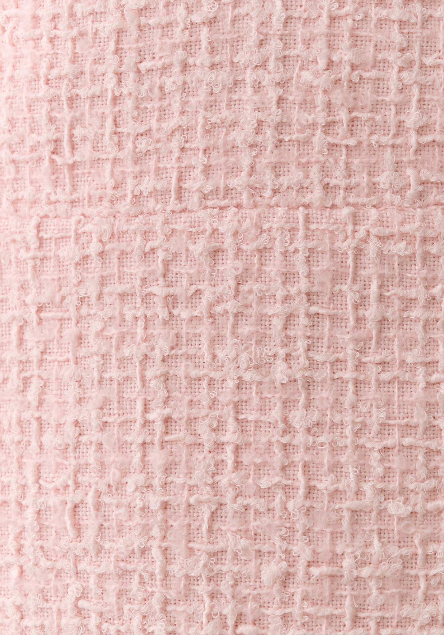 The Odilia Dress features a V-neckline and delicate straps to create a classic, simple silhouette. Crafted from soft pink tweed for subtle texture and added elegance, this dress is a versatile choice for a range of occasions.