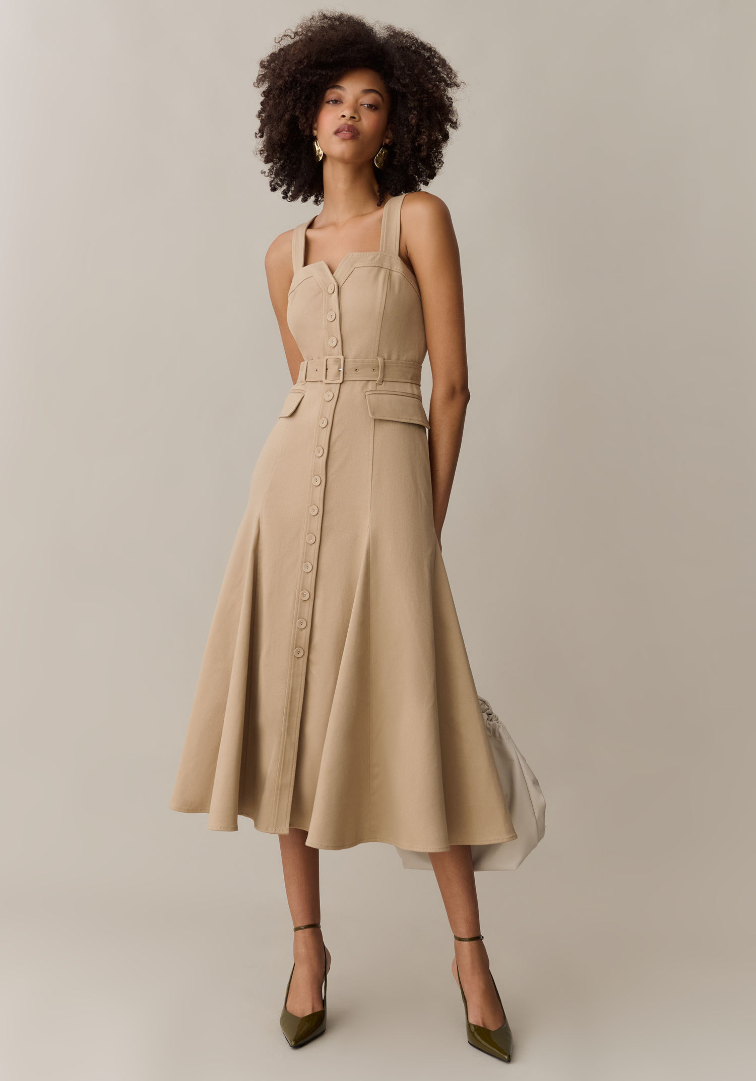 The Raya Dress delivers understated sophistication in a tan button-up silhouette. Its adjustable waist ensures a personalized fit, while cargo style pockets add contemporary edge.