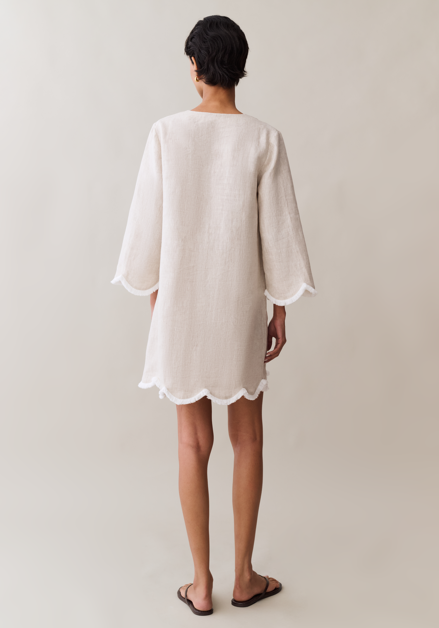 Step into coastal elegance with this effortless oatmeal mini dress. Crafted from a breathable, textured linen blend, it features a clean V-neckline and a relaxed shift silhouette that drapes beautifully. The standout scalloped hem and wide sleeves are finished with delicate frayed white edging, bringing an artisanal, laid-back charm to your wardrobe.