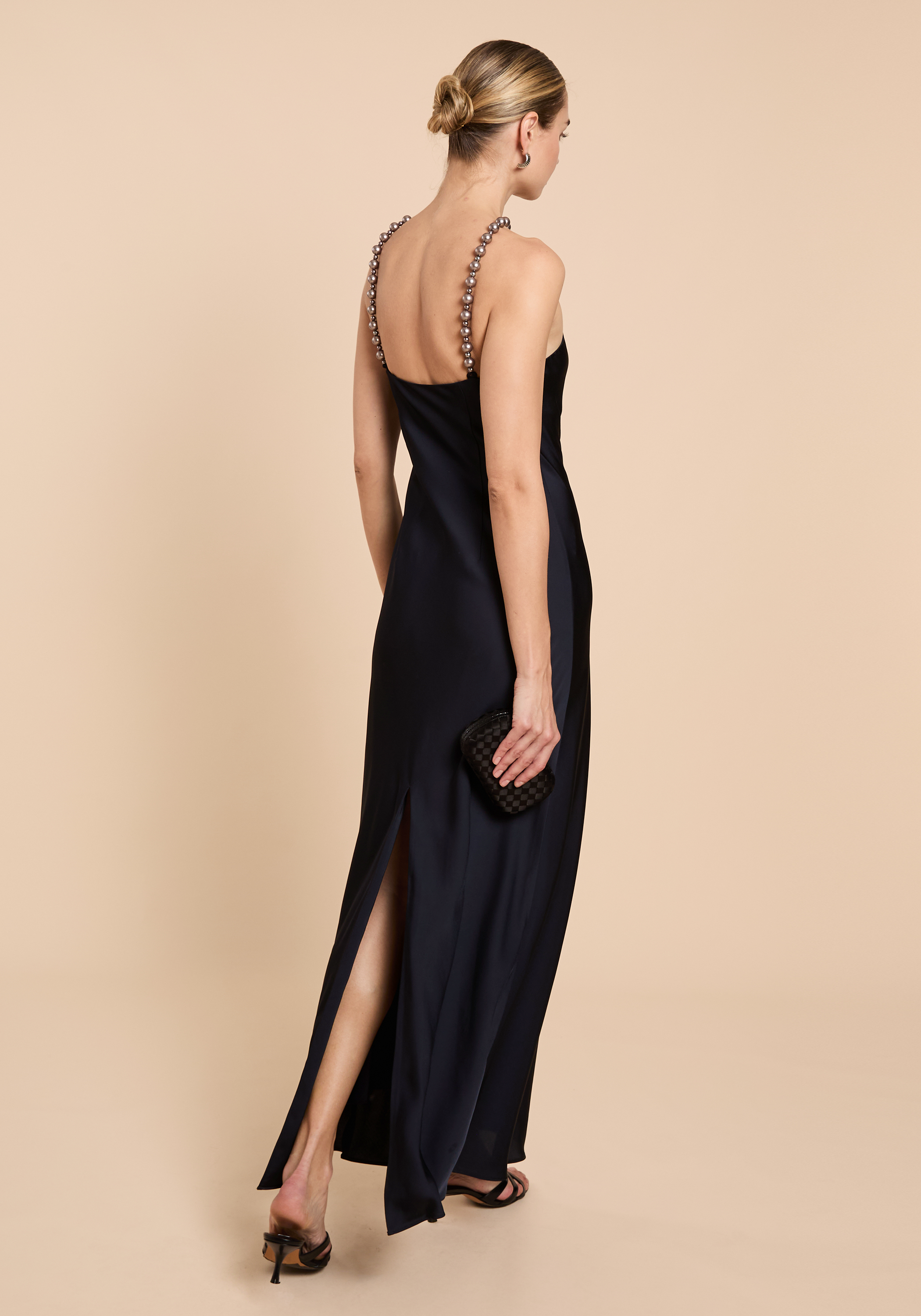 The Auli Dress features a luxurious navy silky fabric that drapes elegantly for a sleek, chic silhouette. Its standout detail is the delicate silver pearl bead embellishment along the neckline, adding a unique and sophisticated touch.