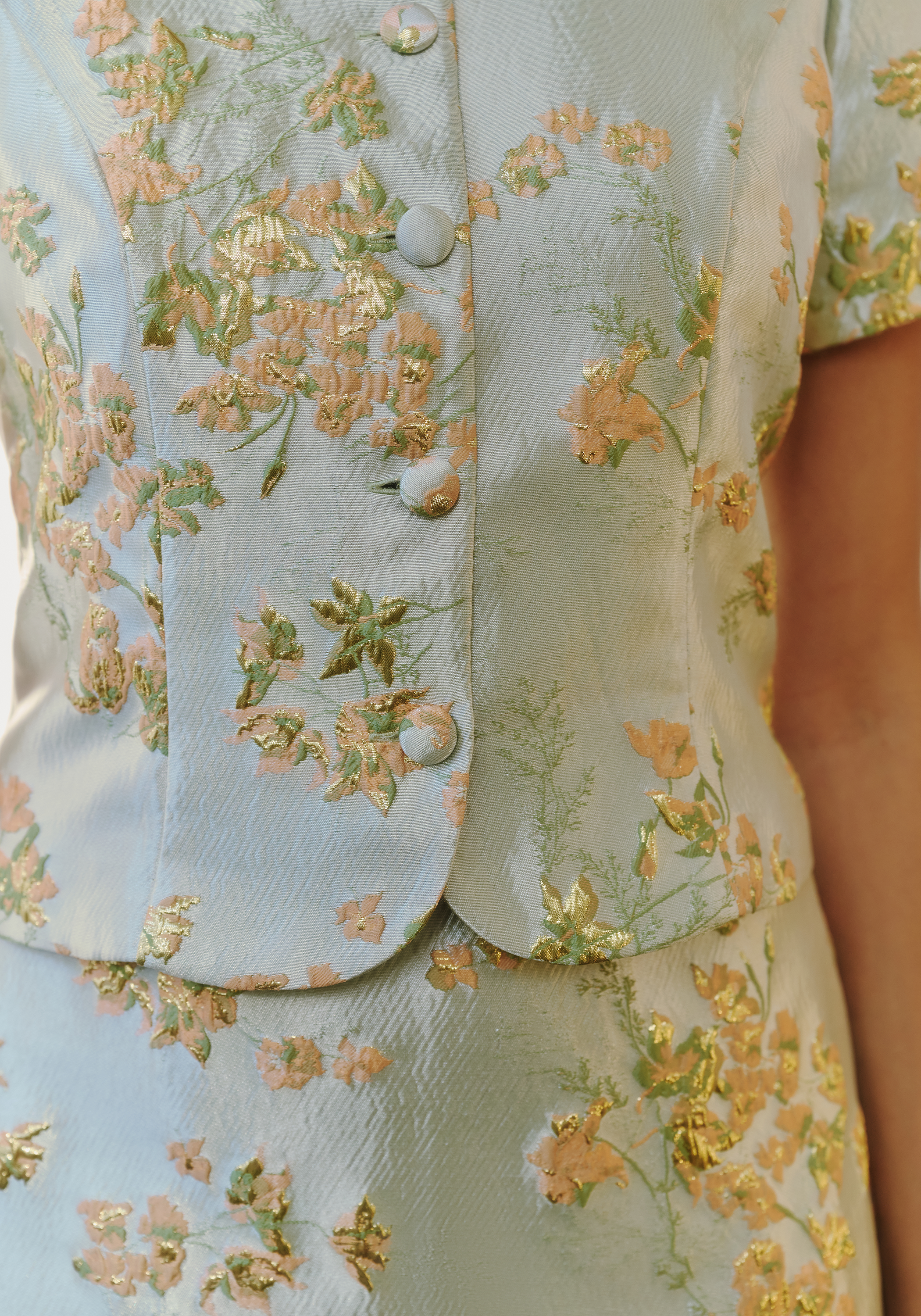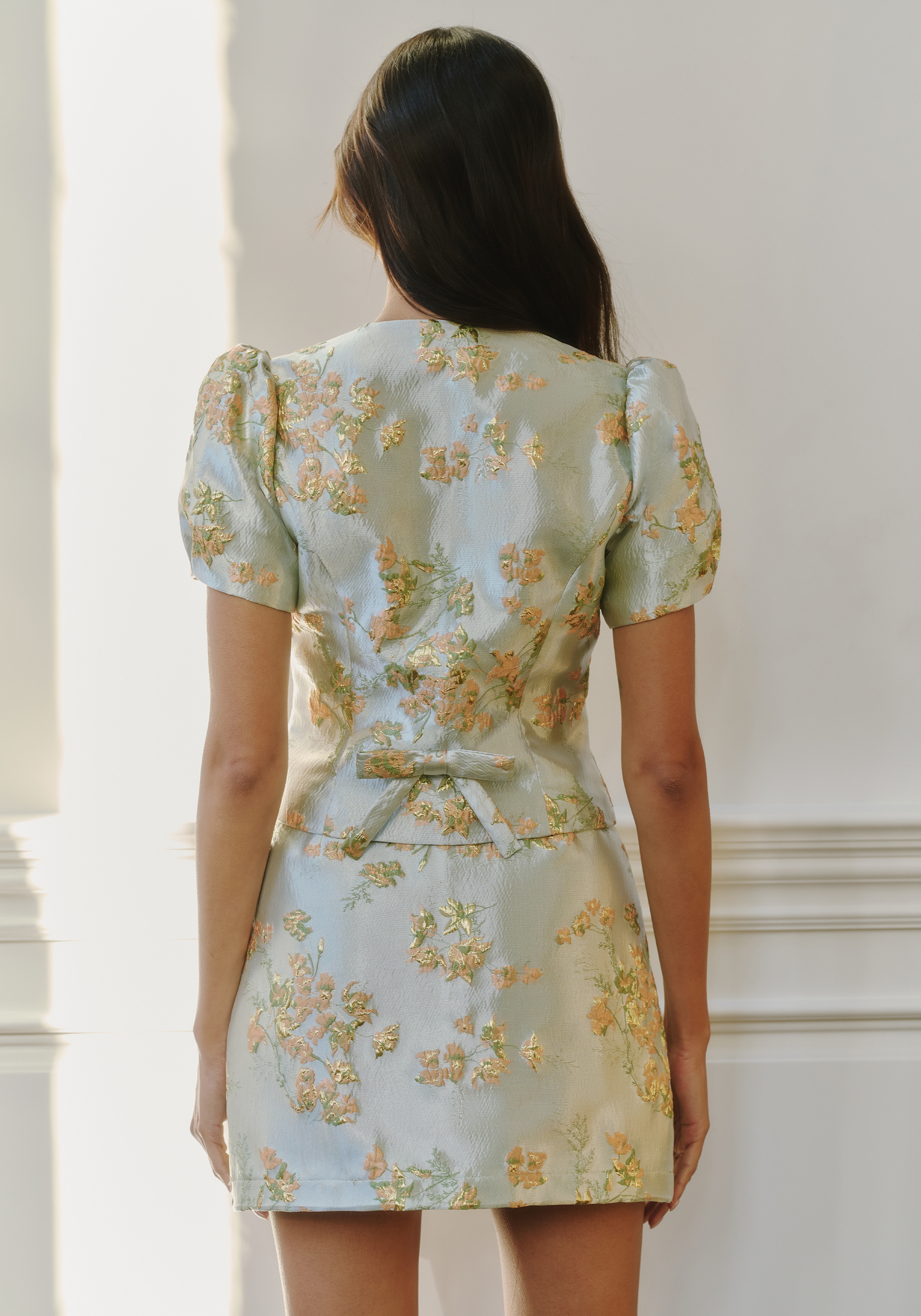 Introducing the Aurea Set, your new go-to for effortless elegance. The floral brocade fabric glows with gold accents and a delicate sheen that feels luxe without trying too hard. Paired with polished buttons, romantic puff sleeves, and a flirty mini skirt, this set strikes the perfect balance between sophisticated and fun.