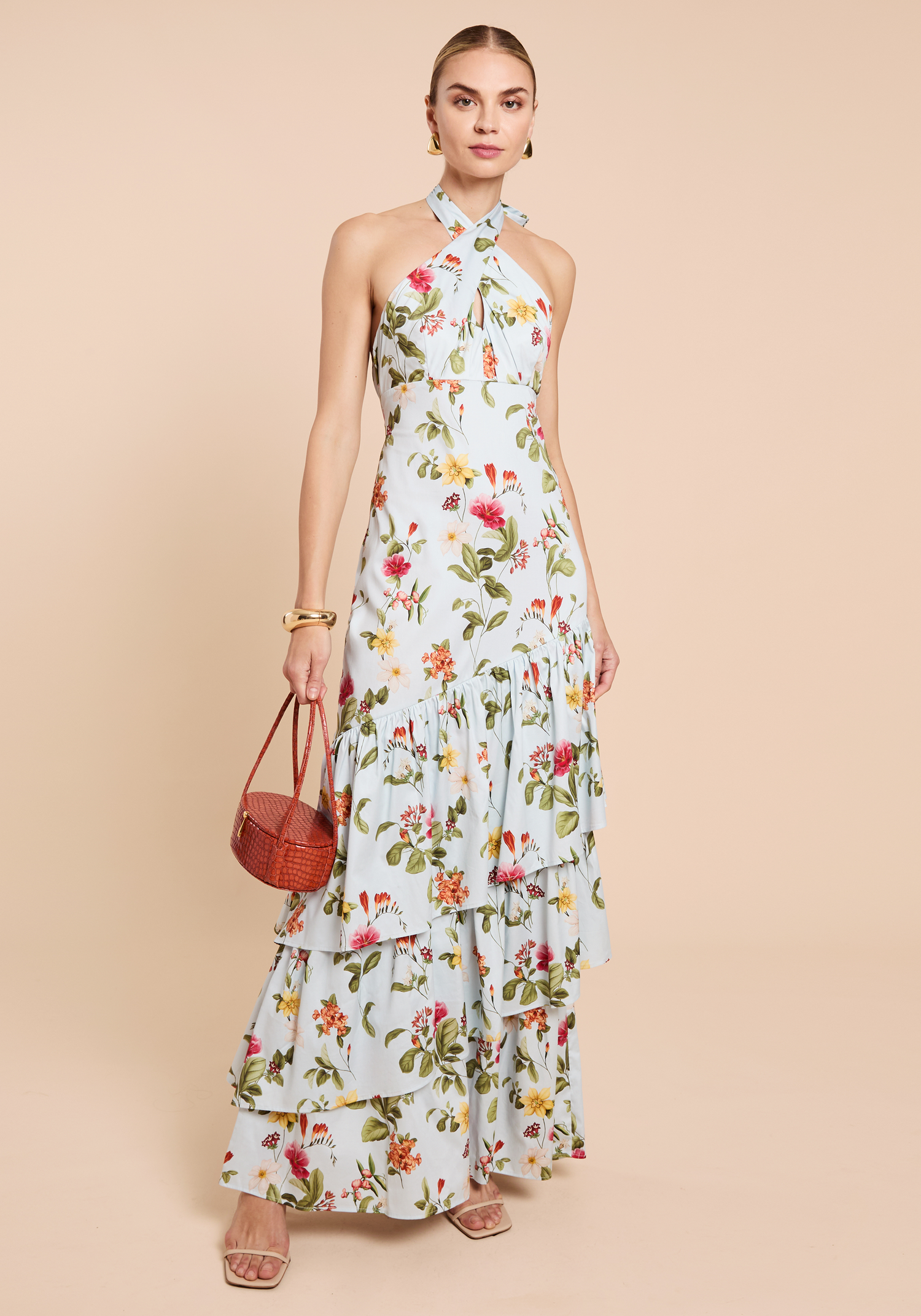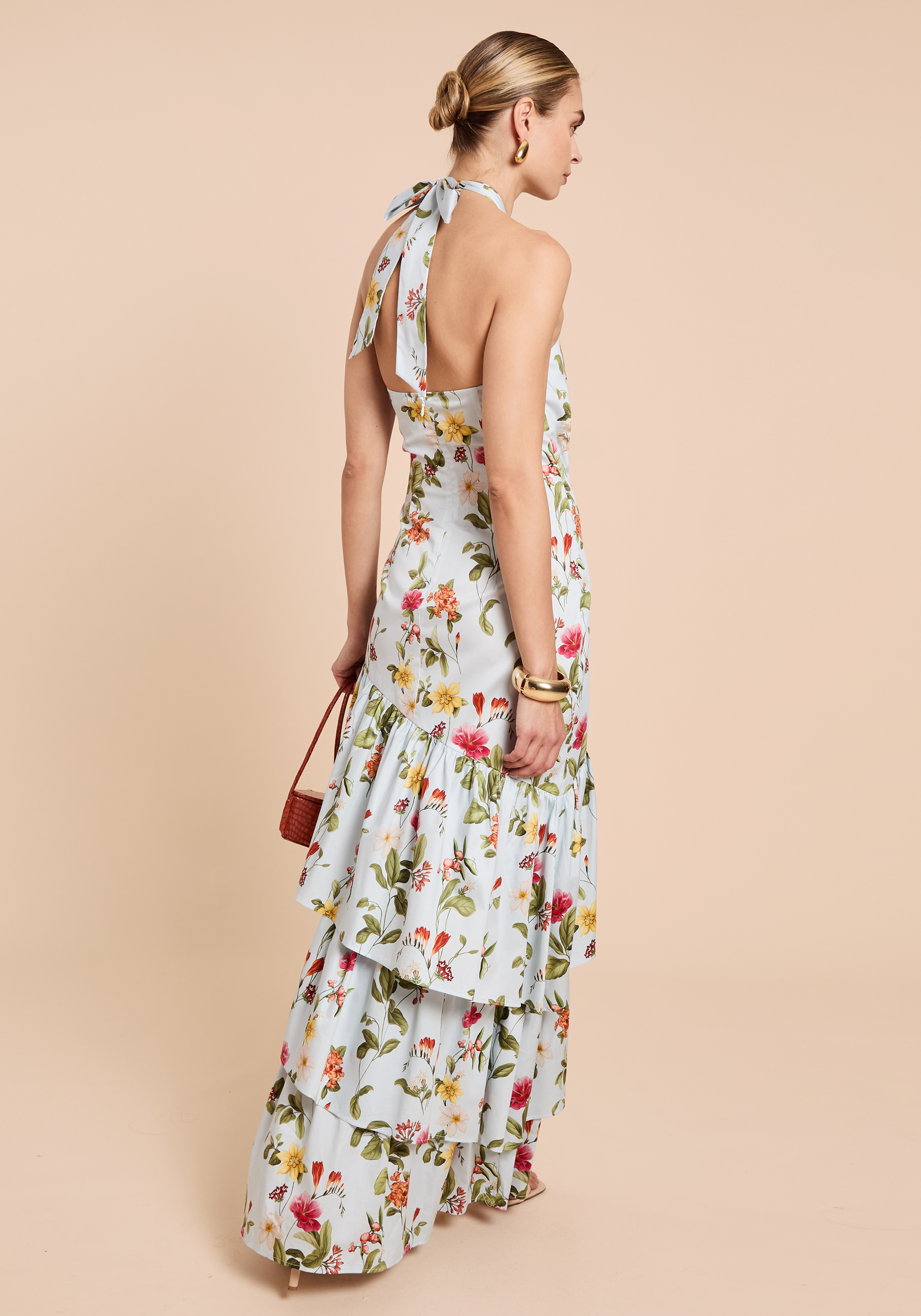 The Oli Dress features a sophisticated halter neck tie that creates an adjustable yet elegant neckline. Its full-length silhouette is enhanced by cascading tiers of ruffles, creating a flowy skirt that moves gracefully with every step.