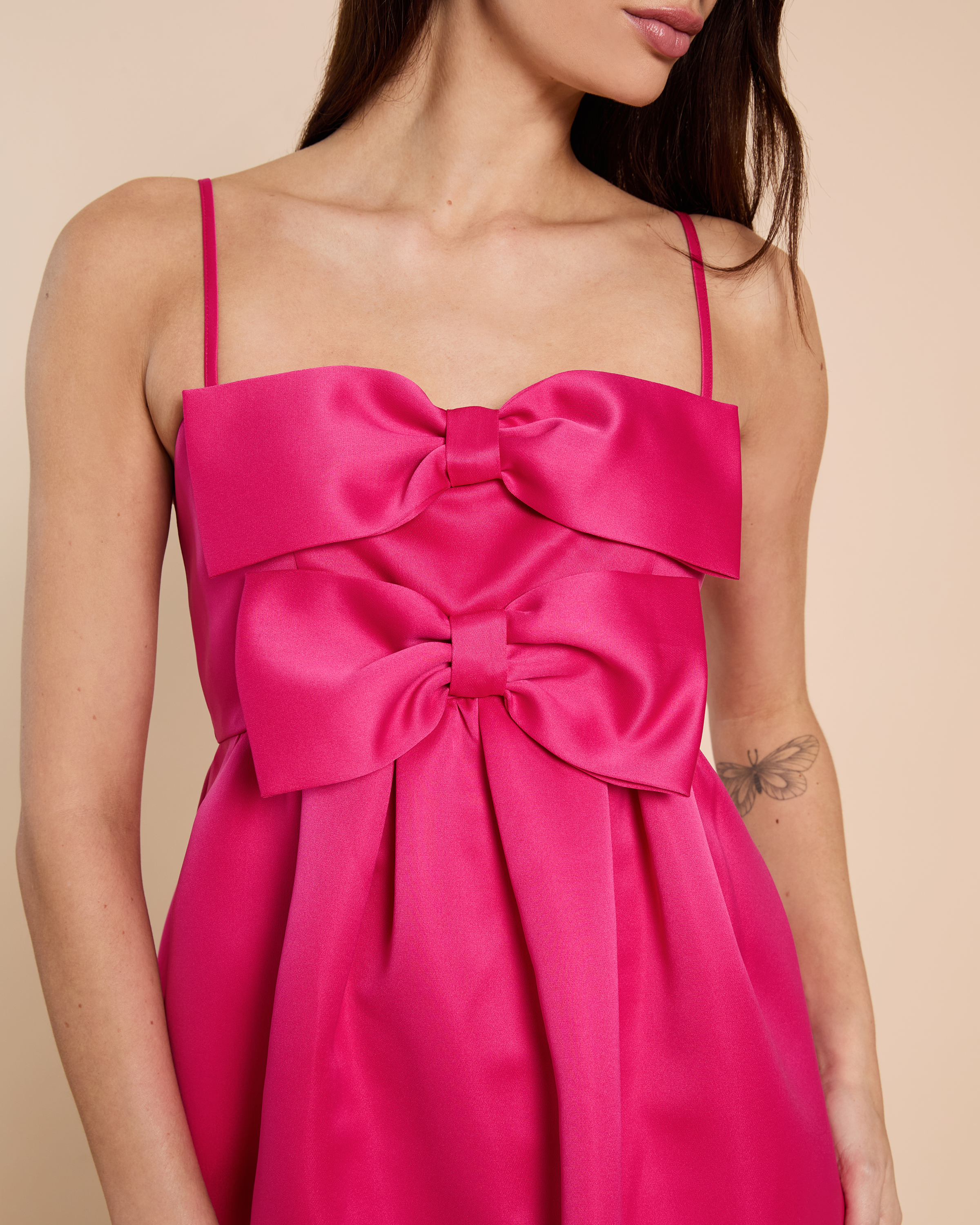 Bloom in the Poppy Dress. Done in a vibrant pink hue with a relaxed silhouette for effortless comfort while maintaining a flattering shape. Adorned by two decorative bows, this fun and flirty mini dress combines playful elements with a sophisticated design.