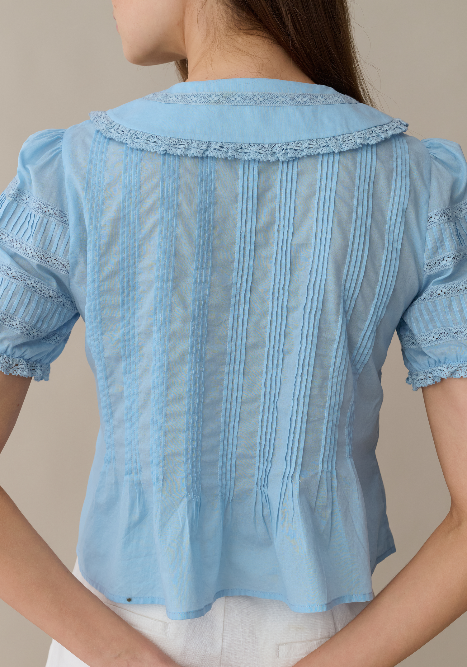 Featuring a charming oversized collar with delicate lace trim, this top offers a nostalgic yet polished take on classic shirting. The intricate combination of vertical pintucks and lace paneling creates a light, airy texture that pairs perfectly with casual denim or tailored separates.
