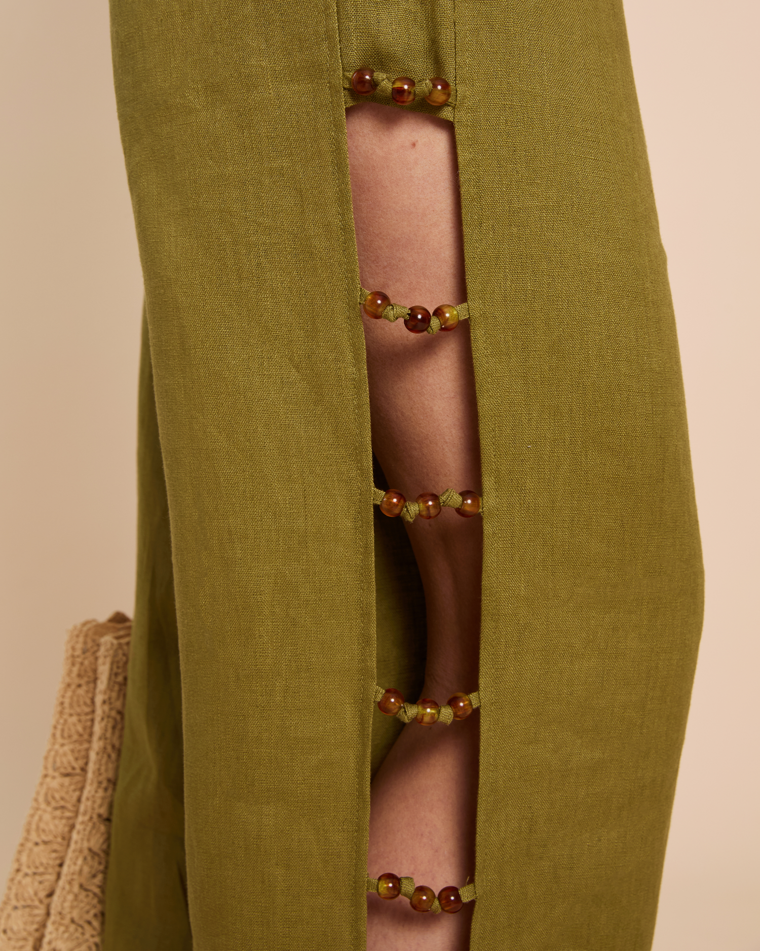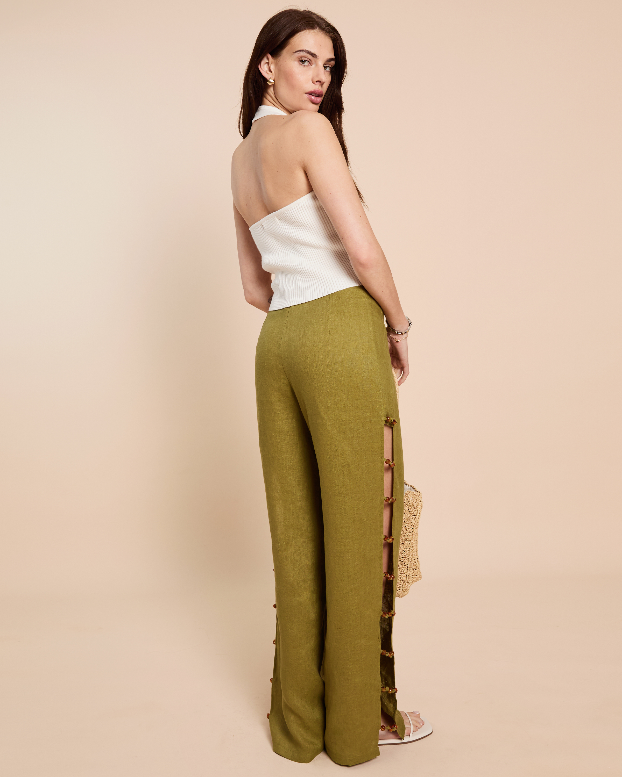 The Malia Linen Pant features eye-catching leg cut-outs and decorative beading. This mid-rise design combines breathable linen with unique details for a fresh, summery look that transitions effortlessly from casual to dressy occasions.