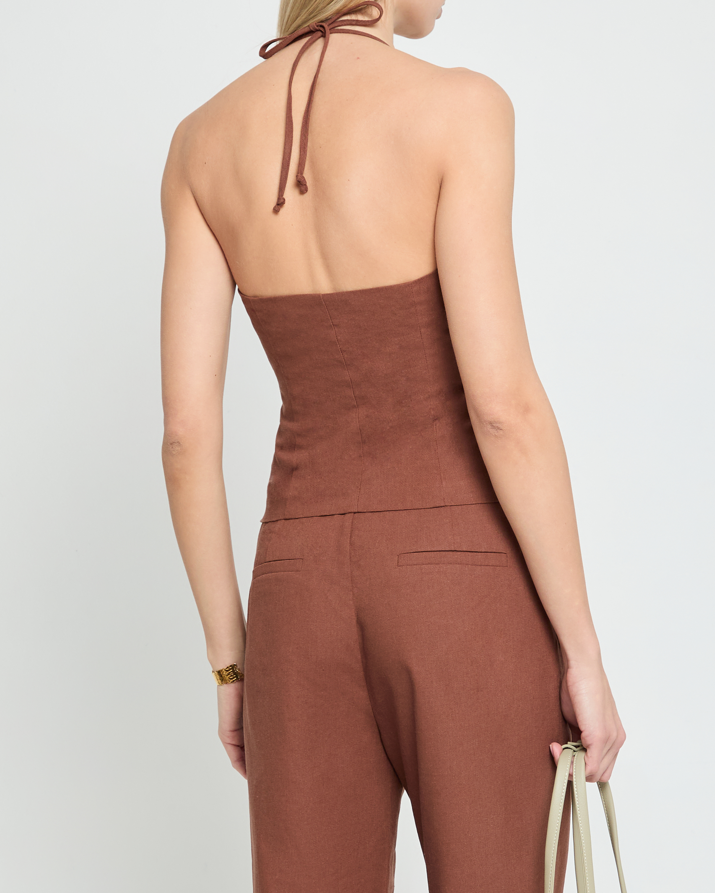 Made from a luxurious linen blend, this form-fitting top features a simple and chic design that is perfect for any occasion. The adjustable halterneck allows for an easy and customizable fit, while the bead details add a touch of fun.