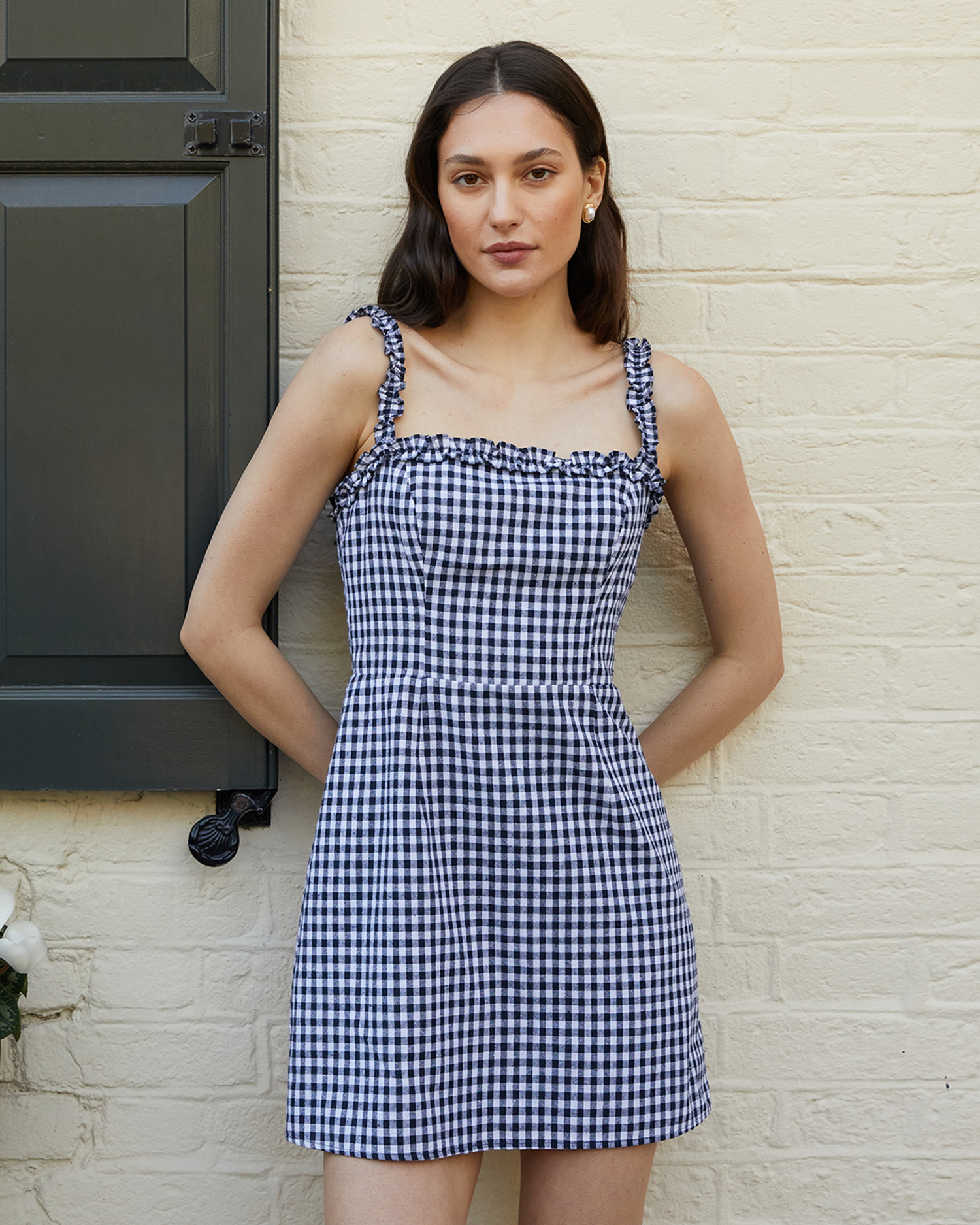 Oh so effortless, the Solange Dress is a must-have with its adorable mini length and navy gingham pattern. The ruffled neckline and strap detailing add a touch of charm to the easy silhouette.