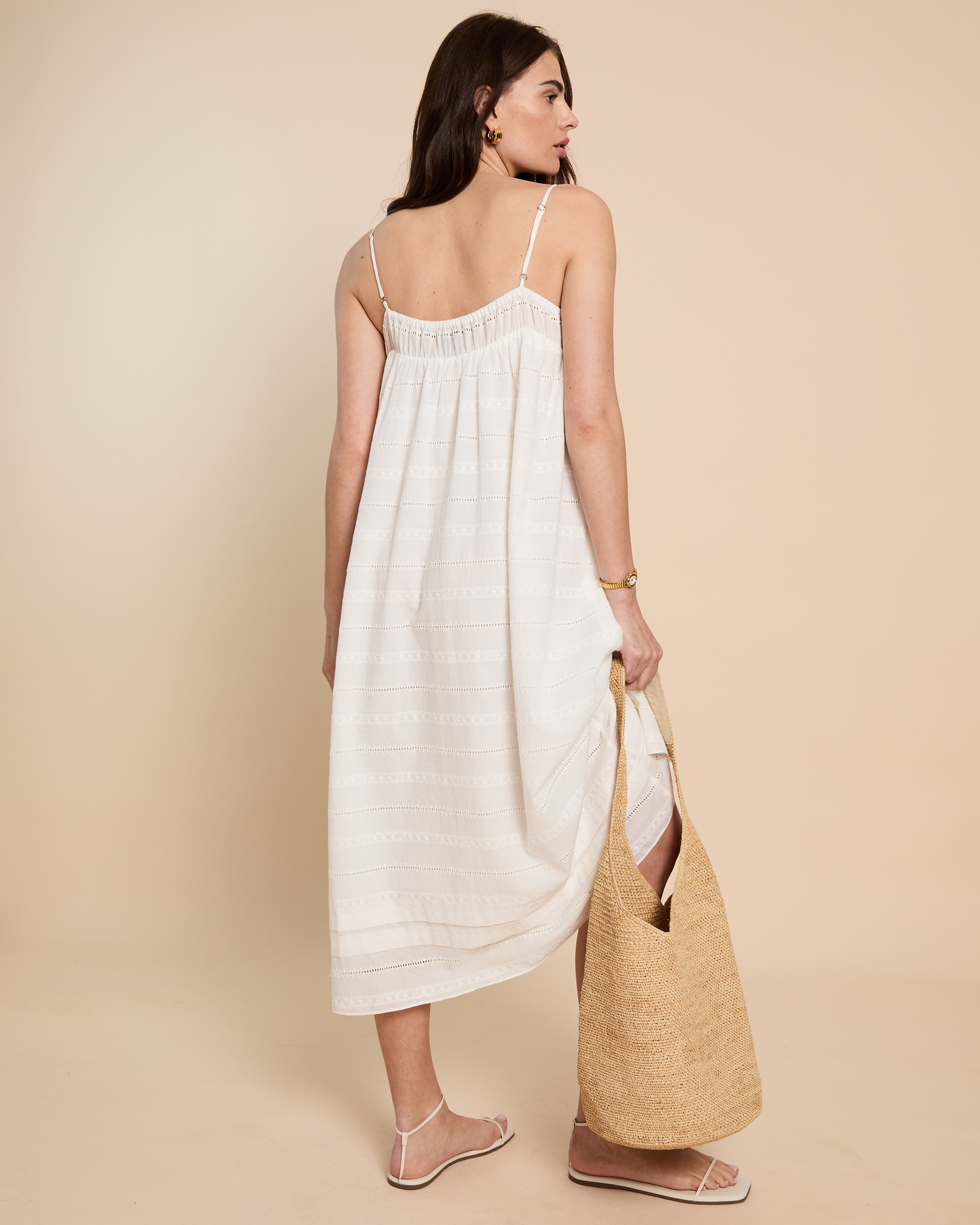 The Margot Cotton Dress combines crisp white cotton with elegant eyelet lace trim for effortless summer style. Features a flattering and relaxed maxi silhouette and refined neckline tie detail, perfect for sun-filled days when sophistication meets comfort.