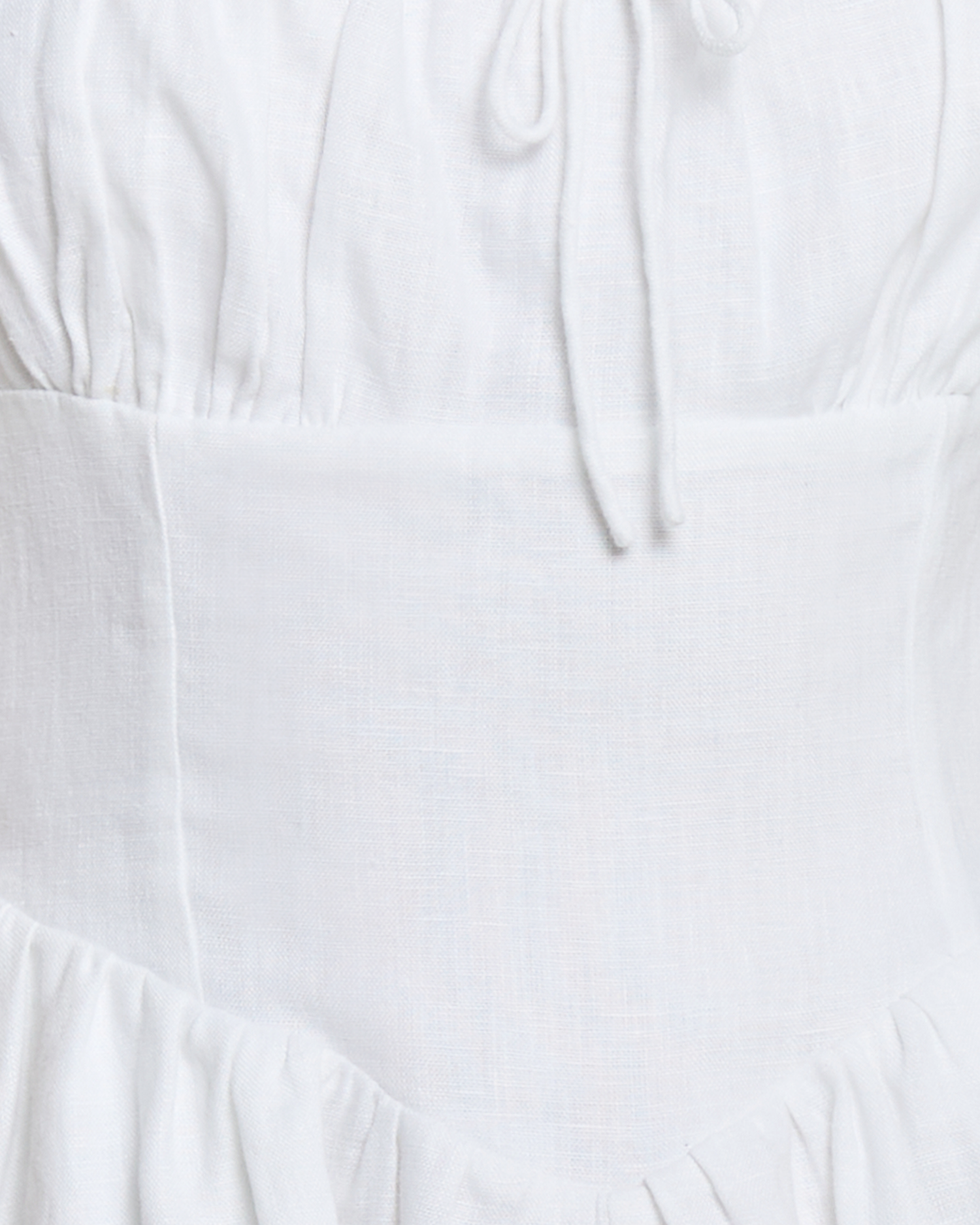This Sierra Linen Dress features a fitted waist and ruched bust for a flattering look. The adorable bow detail and flouncy mini skirt add a touch of charm. Made from light linen, this dress is perfect for warm weather and will keep you feeling comfortable and stylish all day long.